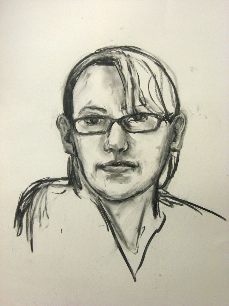 For now I have a quick charcoal study that I did after doing my painted self-portrait. I guess I did it because I got a lot of feedback that the painting that was very nice, but not quite “right”. My husband told me that in this one I had captured my likeness pretty much bang on and my response was that yes, I had captured my big ears, big nose, and stringy hair perfectly. Maybe that’s why it looks more like me. Maybe without meaning to I had idealized myself somewhat in the painted portrait. I’m looking at the charcoal study now and wondering if I did the opposite. Are my ears really that big? I think yes and no. Yes because they are pretty much that size, but no because I think I did a bit too much shading on them which actually draws attention to them.
