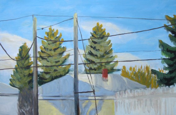 This painting was supposed to be my post last week but I changed the lighting in it, deciding to paint a sunny dusk after starting it on overcast days and hence it has taken twice as long. Next time I think I will just start a second painting. This one was done between 5:00pm and 5:30pm in four sittings (four different days). It is actually sunset but the yard faces east so you just get the reflection of sun on everything. It’s very much a collage image since the sky was finished one day, the lighting on the trees and houses on another day and the shadows on the rooftops were done on a different day still. This exact image and lighting never actually existed all together.