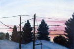 I’ve been looking at the five backyard paintings that I’ve done so far and it occurred to me today that I think I am done one mini-series. I had them set up in the rec. room downstairs and I passed them every time I went into my studio. I noticed that I had done a 7 am, 11 am, 3 pm, 5 pm, and 7 pm between October and March—basically my backyard throughout the day in wintertime. If I do paintings of similar daytime intervals between April and August, which is exactly what I think I’ll do, I will have a series of my backyard in summertime.