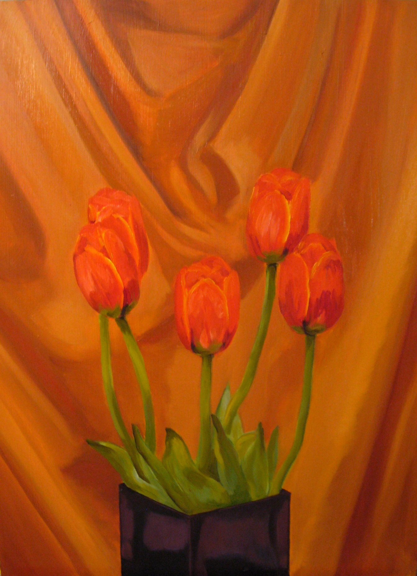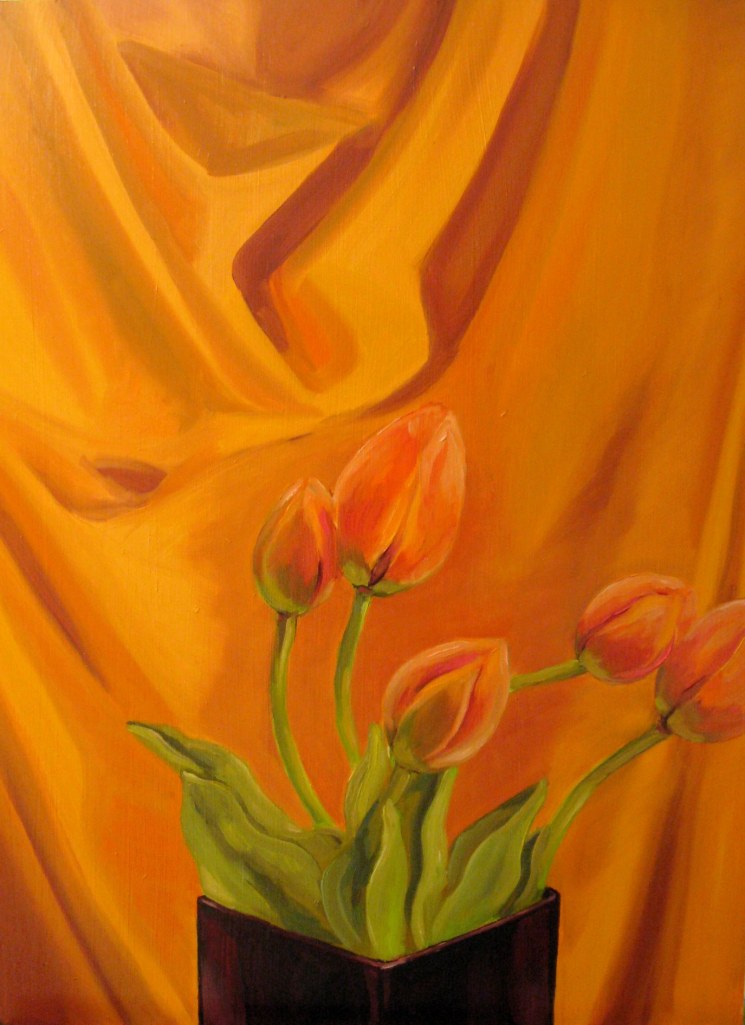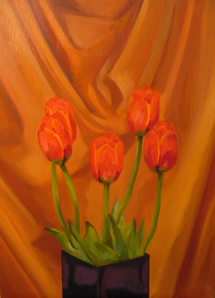 I did do a diptych with dying tulips way back in 2003, while I was in university. My photos of them aren’t very good so I will have to remember to re-photograph them the next time I visit my sister (where they are hanging in her stairwell). I was feeling so good about these new tulip paintings and feeling like I was “back” until I looked up the 2003 tulip paintings. The 2003 ones are still better. I am getting better and my technique and colour execution has gotten better, but I’m still not “back”. Argh! It’s a funny thing when you realize that all your university professors were right and that it is indeed very hard to get back into art once you’ve taken a break. Though I have formed the habit of making art again, which is something; when I don’t paint for three days it feels like it’s been weeks.