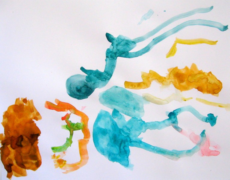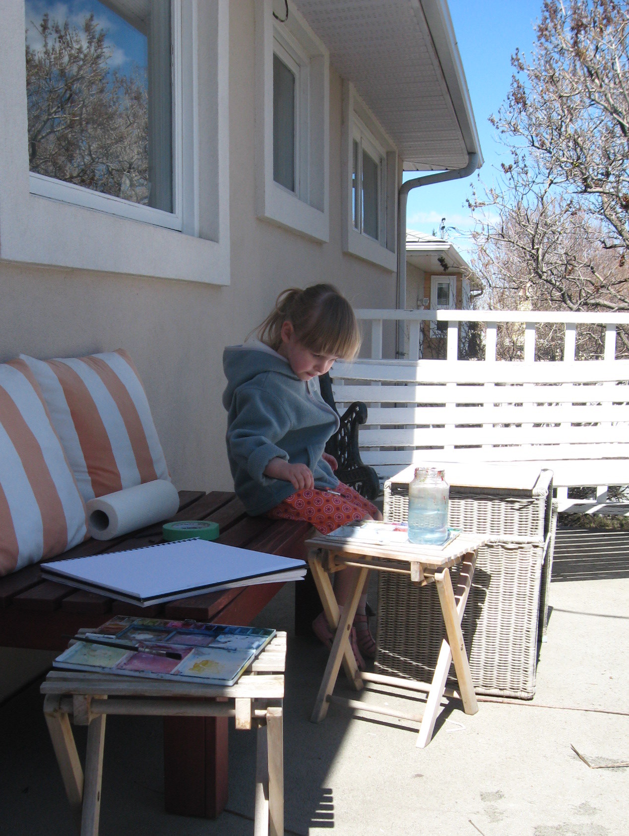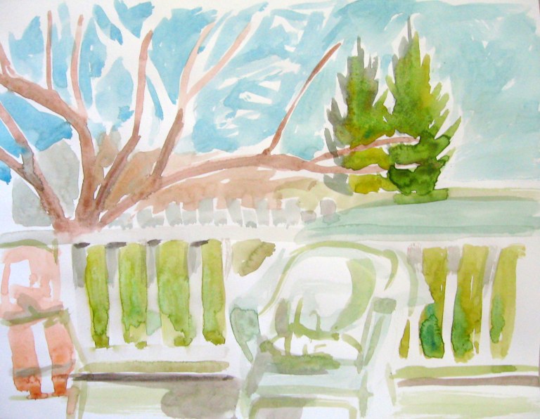 My daughter and I did some watercolour painting out on the deck today and, as ever, I am fascinated with her paintings. Take a look at the similarities between our paintings today—the colours and the compositional elements of the view that we had of the backyard. The odd thing is that she started her painting first. She has the orange rectangle where the orange deck chair is and the blue shape up top is reminiscent of the arching honeysuckle tree branches. Is it by chance that she painted it the way she did or did she, at only 3 years old, pick up on colours and compositional elements in front of her? Maybe she started imitating my painting once I started, or maybe I was actually influenced by hers, who knows. Regardless, I am finding myself artistically inspired by her more and more.
