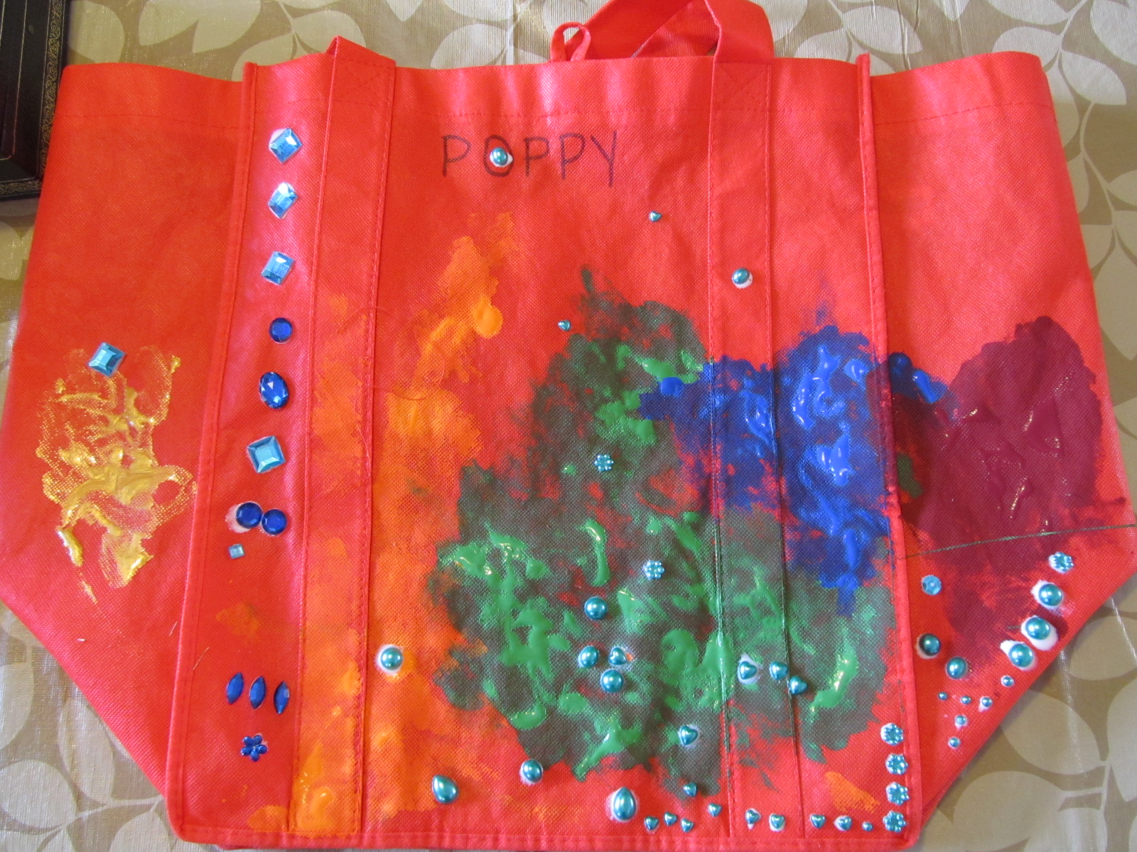 Poppy is settling right in with all of it. After doing a second pure orange painting, she is now back to doing more “detailed” works. It started with her school bag that the playschool gave each child to decorate as they please at home. We went to the dollar store and picked out 5 fabric paints and some blue gems that Poppy fell in love with. For the most part we just let her go to it though I helped her to glue on the gems as she directed me with exactly where to glue them.