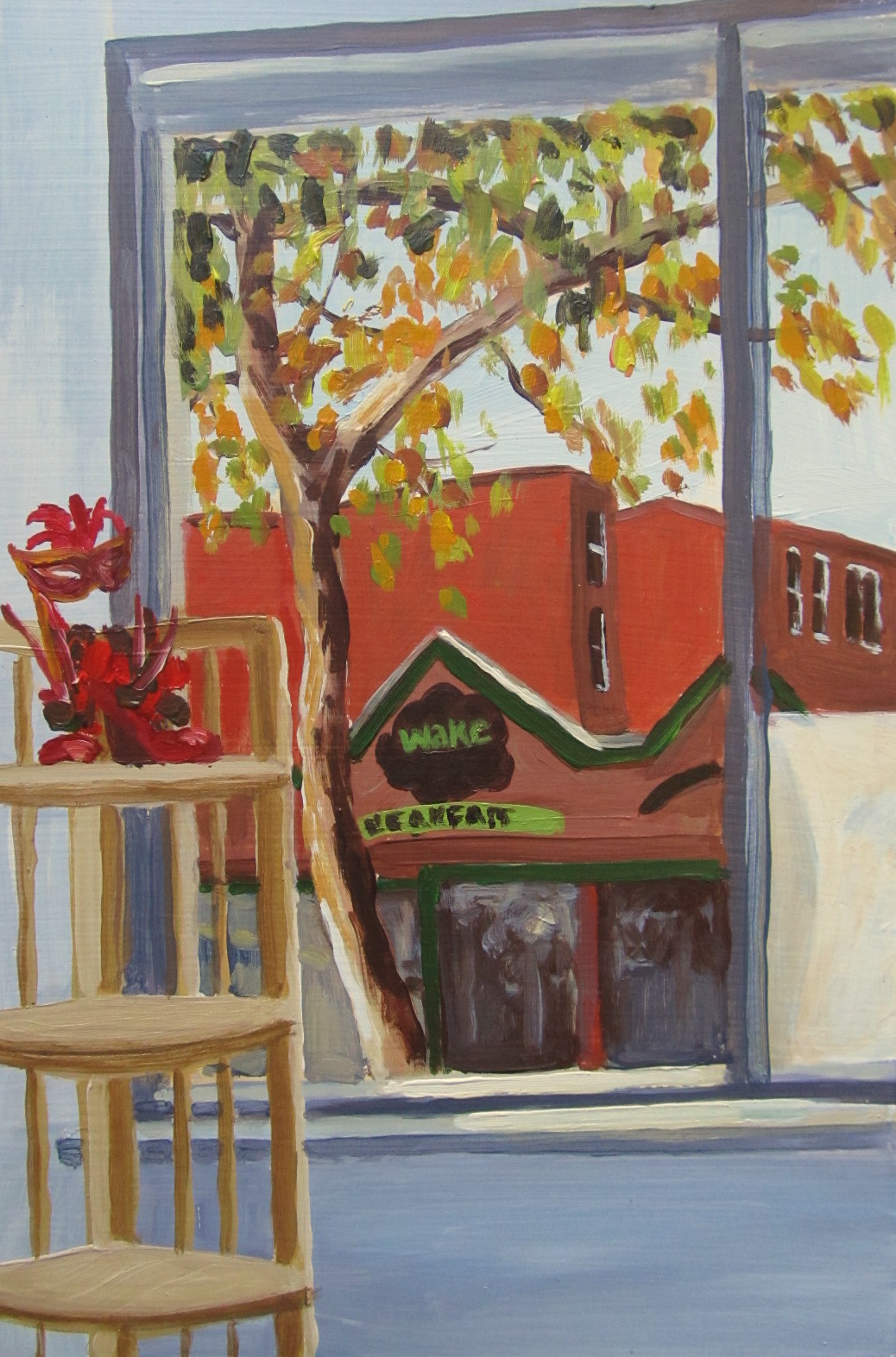 I think my most noticeable achievement this year was reforming the habit of making art, with the blog functioning as the deadline that I needed. But beyond that I also shook out the cobwebs with applying for shows and started (though just barely started) getting more involved in the art community here and talking to other artists. The newest development is that I have joined a sort of art club that has come about as a result of the Drawing Club I was involved with at my work. We are paying for a Studio space that we will be sharing and using every Sunday. Today was the first session. I painted the view out the window by my easel.