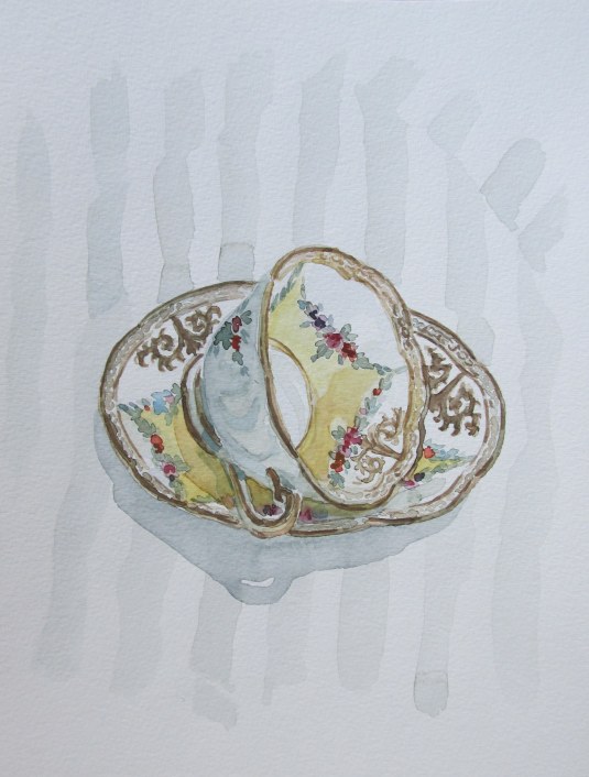 A friend of mine asked for a painting of a tea-cup on its side which, once I started painting it, is much harder than you would think. I discarded the first attempt for this one where I did not get all the circles and angles quite right. I also had not thought about the edges of the tea-cup when I chose this one to paint (one of my favourites from my collection) and the slightly scalloped edges made me a bit loopy. Who knows though—this might turn into another series!