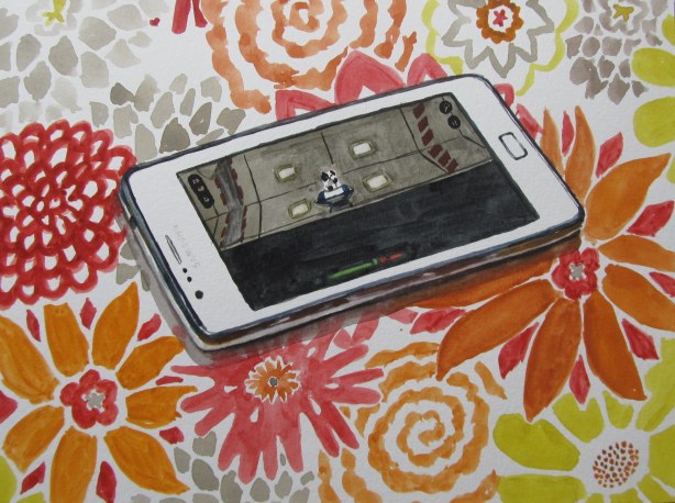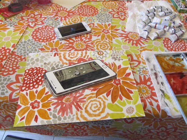 I was having trouble deciding what to paint this week. I kept setting up a still life and taking it down again. In exasperation I asked my four-year old what I should paint and she kept telling me to paint Spacecat (a cat from a game on my smart phone). I kept telling her that I couldn’t paint Spacecat but then I thought, well, why not? So here he is, by request, with my new psychedelic tablecloth!