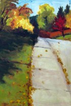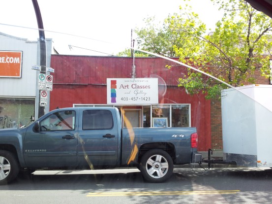 And the second show is at the Kensington studio and gallery where I paint on Sundays (132 – 10 St. NW, Calgary). The studio is called Hughes on Tenth run by artist Nancy Lynn Hughes and every month she invites anyone who rents space at the studio or takes classes from her to submit artwork for themed monthly shows. For June the theme is People and Places and I submitted “Streetscene, September 28”, “Self-portrait with Green Drapes”, and “Living room with Tree, 3pm” (all shown below). This also means that I got to update the current shows section on my blog. Yay!