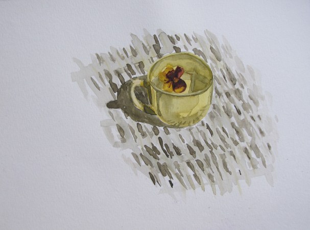 My daughter brought this little flower arrangement to me while I was enjoying the sun on the back deck. It’s a single pansy in one of her play cups. I immediately decided to paint it. When I was nearly finished she brought me three more of them. I was kind of wishing she had brought them all out a bit sooner or that I hadn’t painted it so fast. Oh well, maybe next time.
