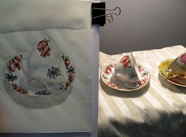 Plus I think this is my best tea-cup to date. I think being paid to do something has made me more careful and less lazy. I spent a lot more time trying to get the shape and pattern right. Here is the painting next to my still life with the two cups (no natural light in my studio so it is hard to photograph in there, looks darker than it is). I set up both tea-cups at the same time so I could make sure the compositions of the two paintings will look nice as a pair. I started with the “easier” tea-cup. I’ll be starting on the yellow and pink and gold one next.