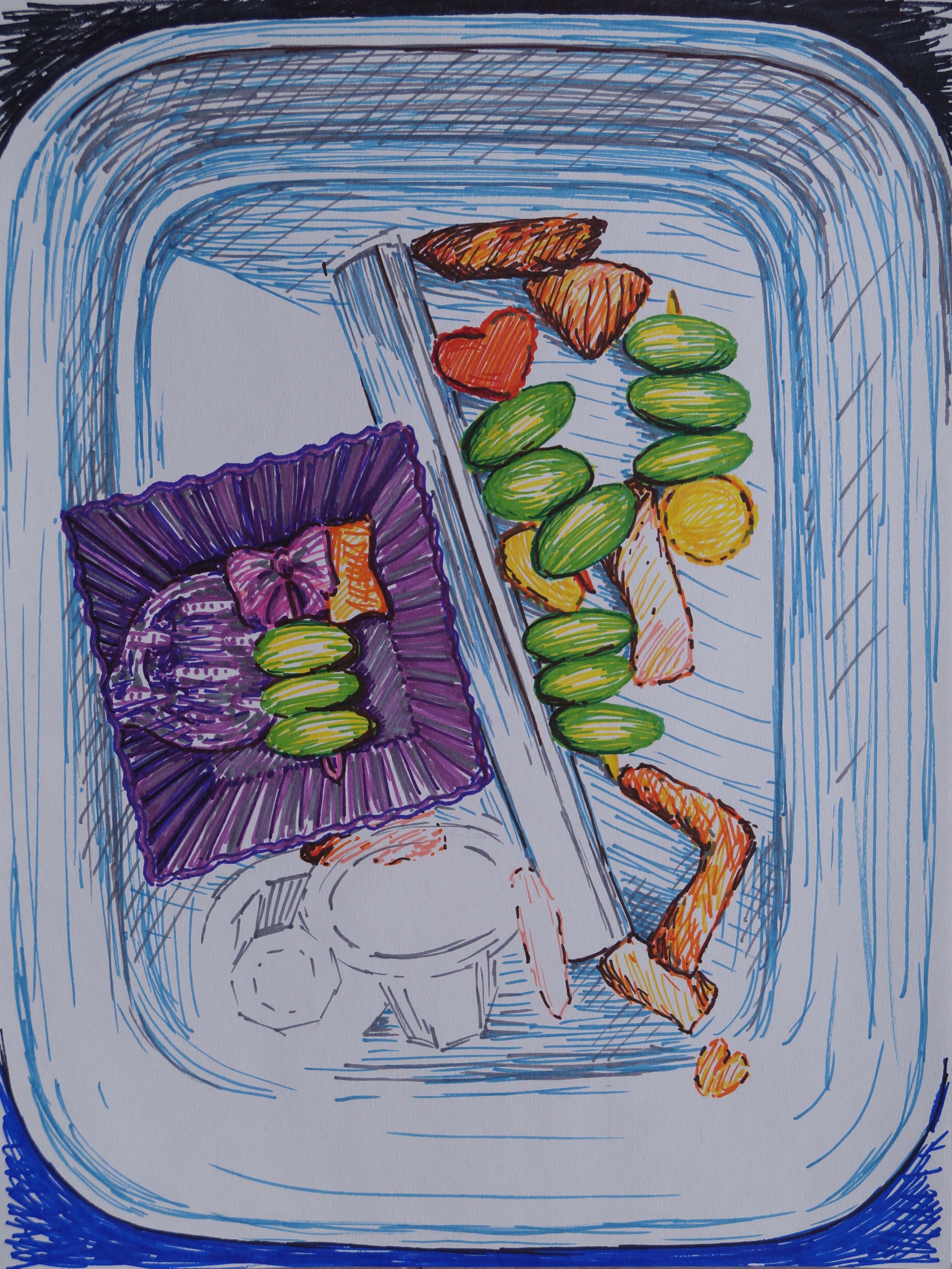 Poppy has decided that she is “allergic” to vegetables. One day I took a photo of her bento at the end of the school day with the uneaten edamame still on the food picks (in order to text it to my husband to complain about it), but then I found that I really liked the photo. I have since started taking photos of her lunches at the end of the day as well as the beginning. It’s interesting to see the contrast between the neat, orderly lunch and the disheveled leftovers. I think next I’ll do a diptych of a before and after bento…maybe in watercolour…