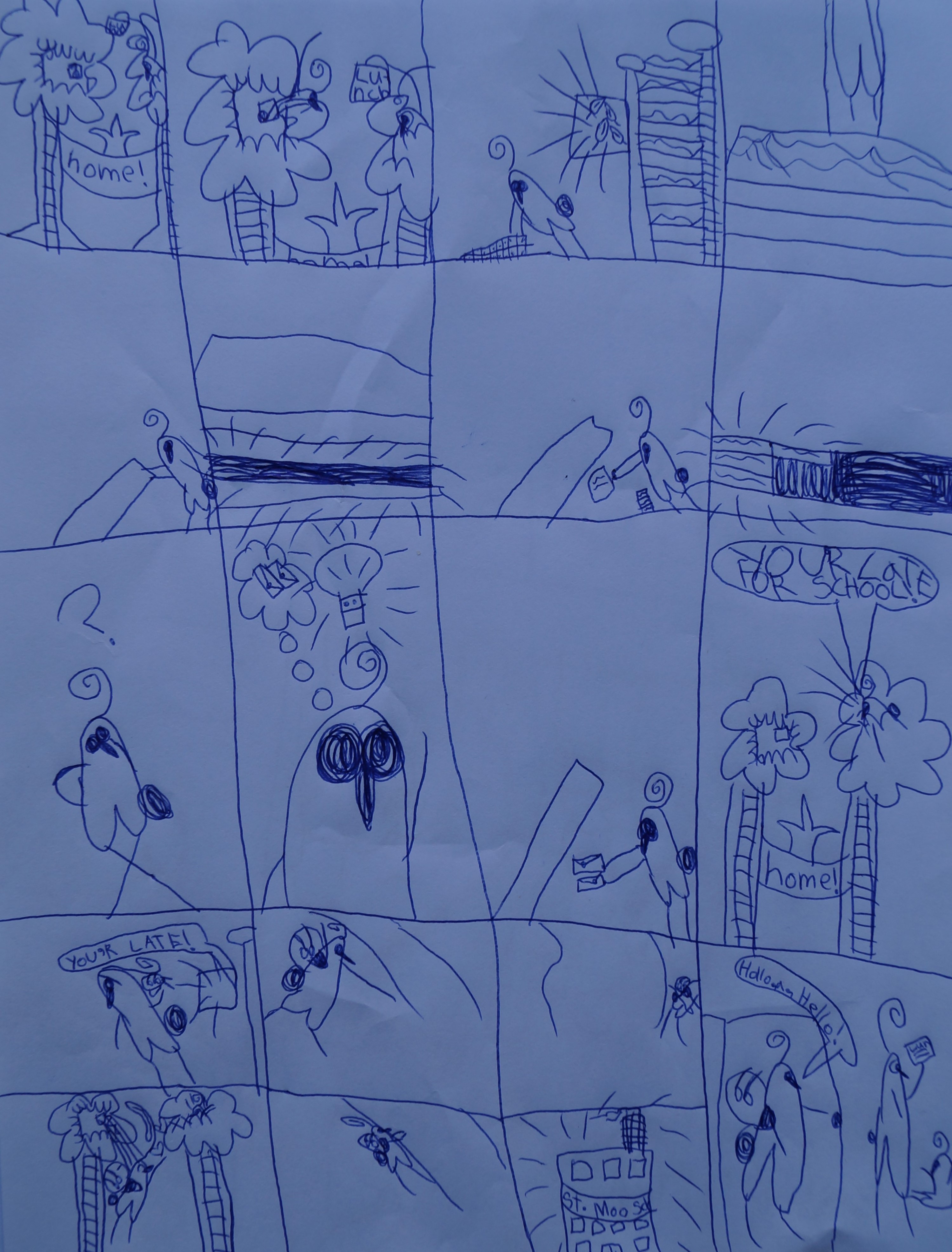 And here are two more of her new Kikwi comic pages. The first is about a Kikwi daydreaming in her room, getting new roller-shoes in the mail, rollering to her school in them, but then the school is closed. The second is about a Kikwi having fun putting things in the crack of her loose floor board, and then being late for school.