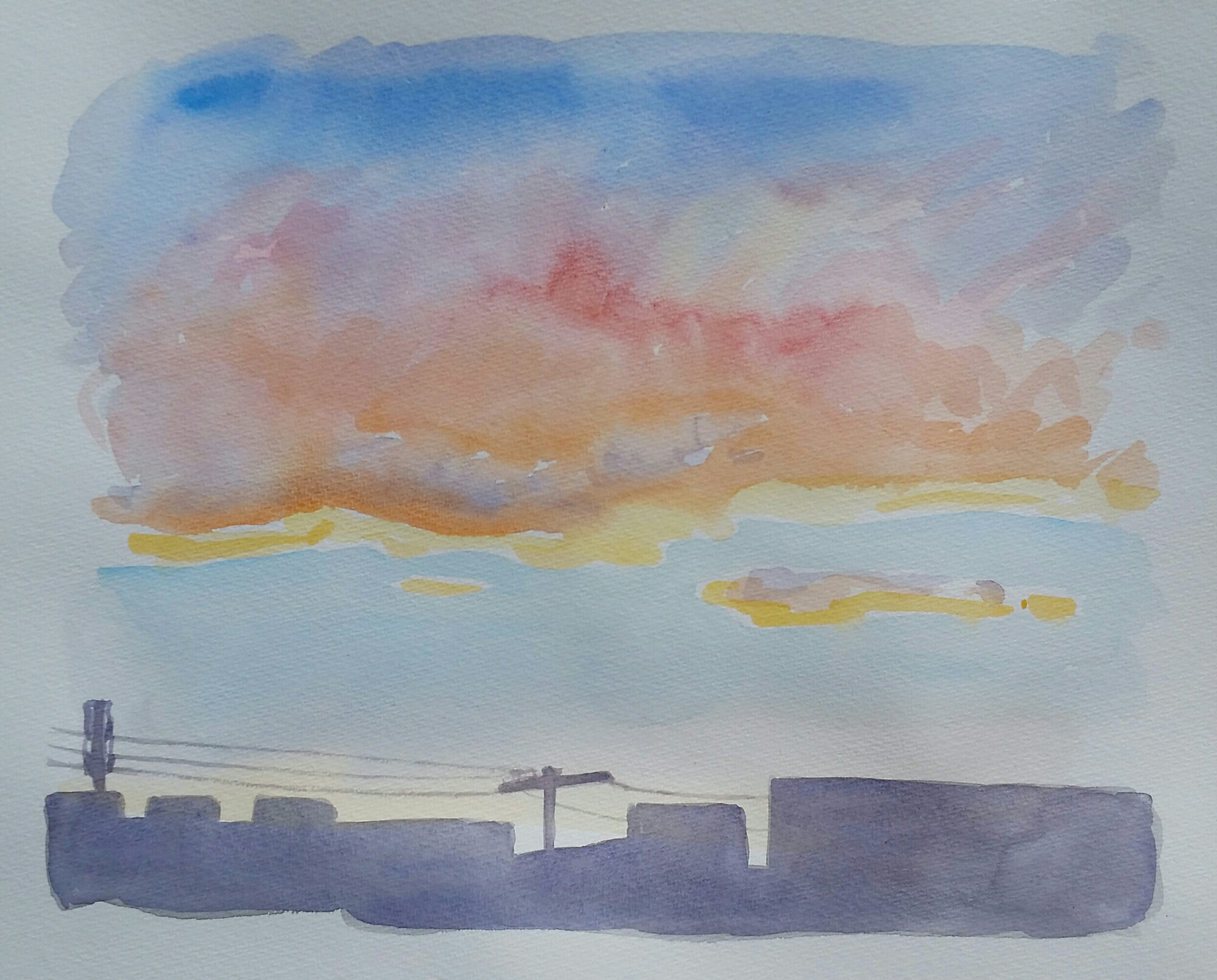 A quick study of the sunset as seen from my living room. It coincided with brushing Poppy’s hair before bedtime, so I happened to be sitting there at the perfect time to grab my paints. I need to do more of these because I really love painting skies.