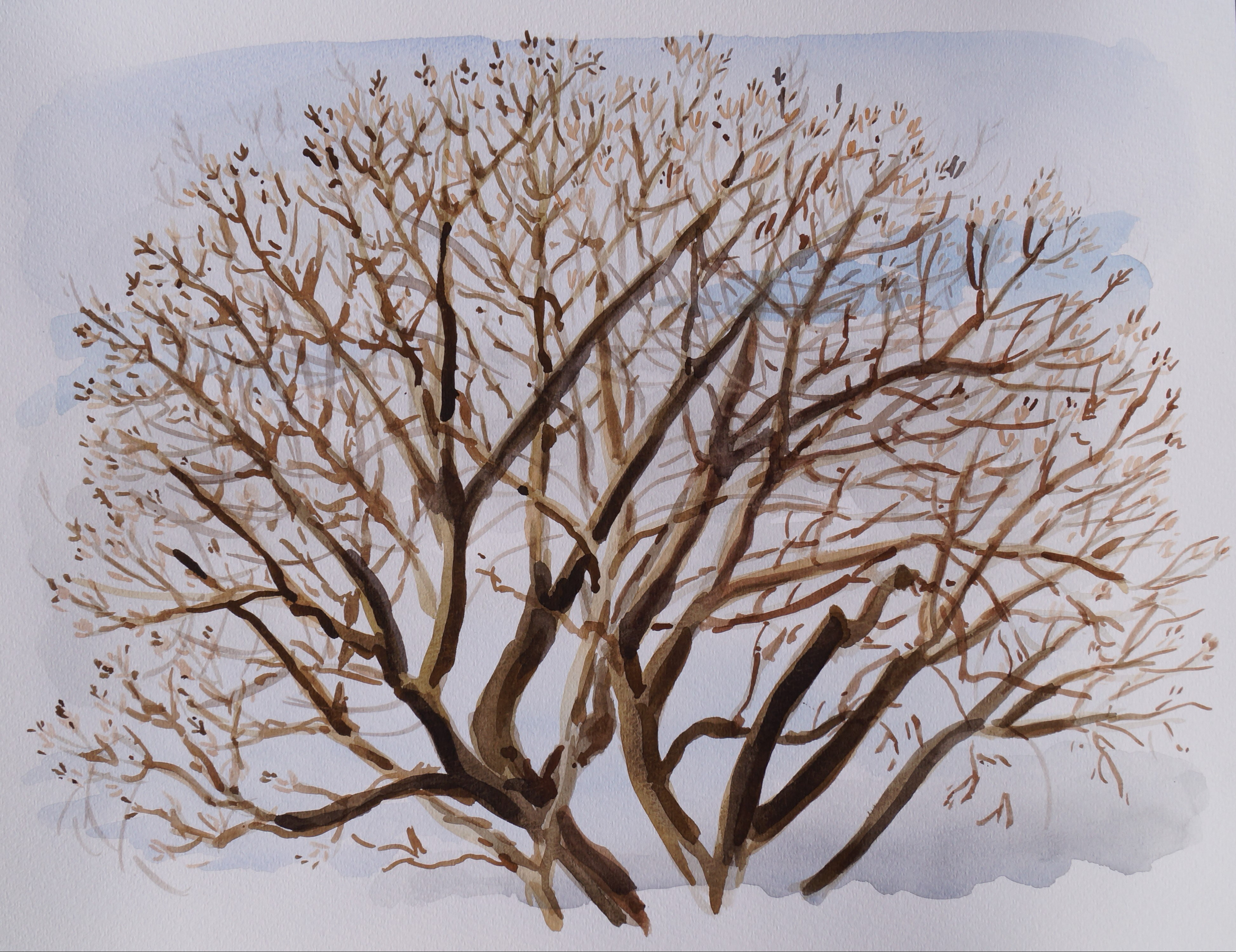It was a work day for me so I didn’t get home until suppertime. I had grand plans to do a sunset painting as soon as I got home, but I forgot that sunset is much later now; and it turned out it was overcast with dull grey skies when I got home anyway. So I decided to paint the giant tree across the back alley–another view I’ve sketched and painted a few times before. I thought if I only did the top of the tree and left out the houses and fence it would be “simpler”. And it was, somewhat, but that tree is never simple.