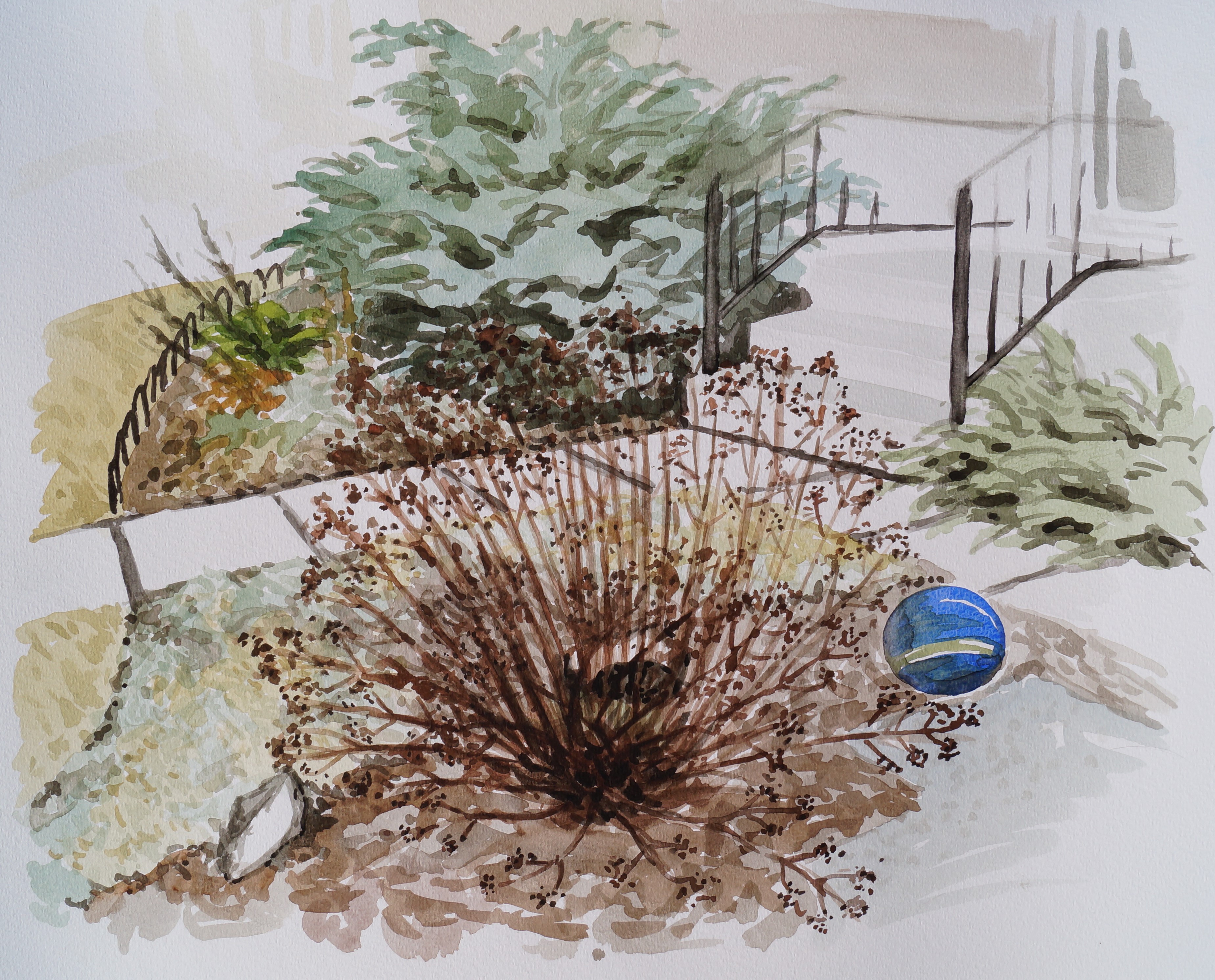 I wanted to paint this flowerbed mostly because of the giant oregano plant in the foreground. It was huge, and purple, and beautiful almost all of last summer with loads of bees visiting it. In about a month or so, after the new growth starts, I will be cutting it back. I hope it gets this big again this summer.