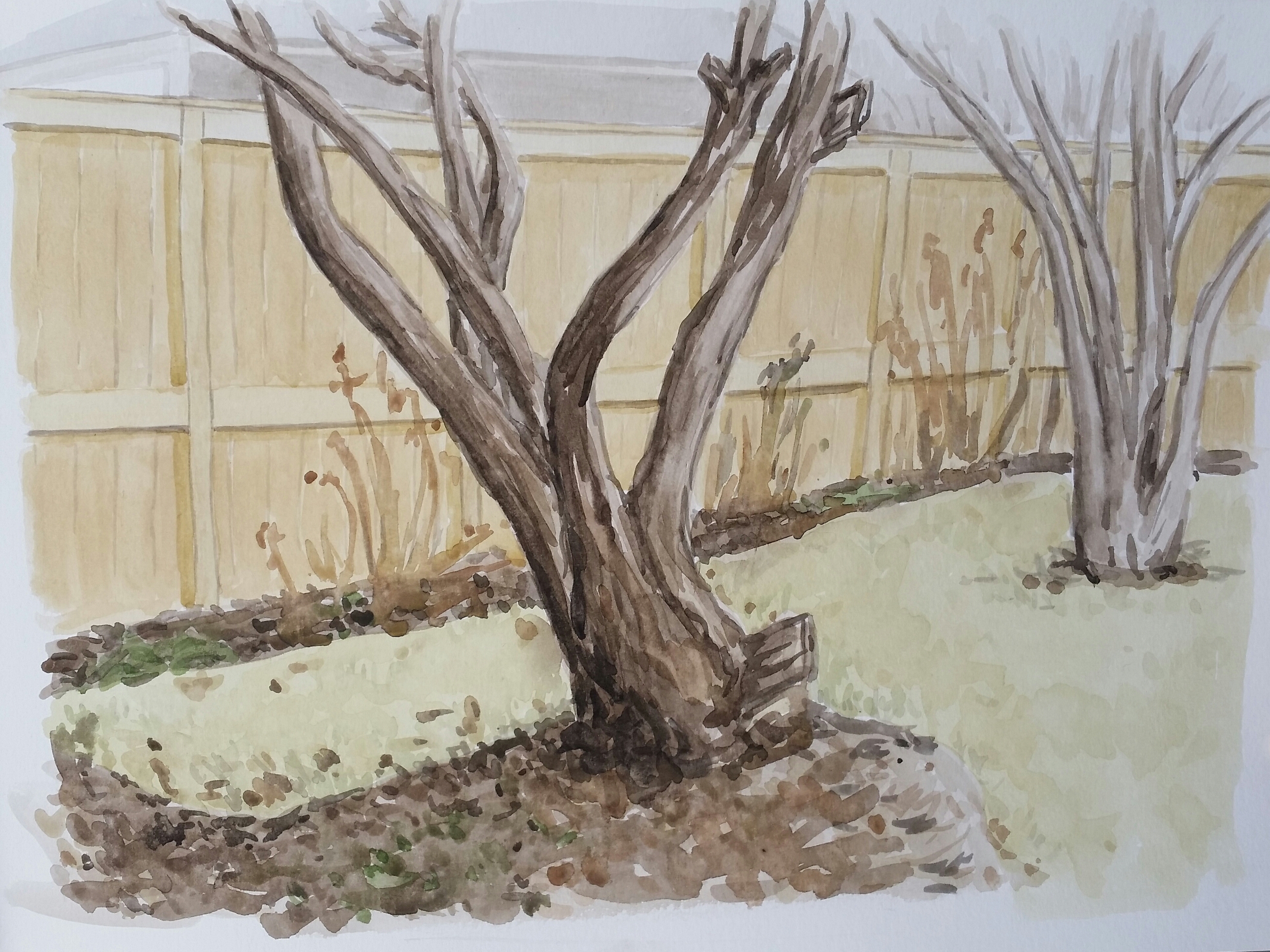 A rainy, overcast day here. It started raining on me while I was out there painting so I had to cut my painting time a bit short. This is one of my favourite garden views, as seen from my shade garden by the house, under the lilac tree. It’s another view that I have painted many times in the summer, but never in the springtime when the garden is still a mess. Although there is actually a lot of perennials coming up underneath all of that. I was out poking around this morning to peek, but I held off on doing any clean-up because there’s still a lot of sleeping ladybugs in there.