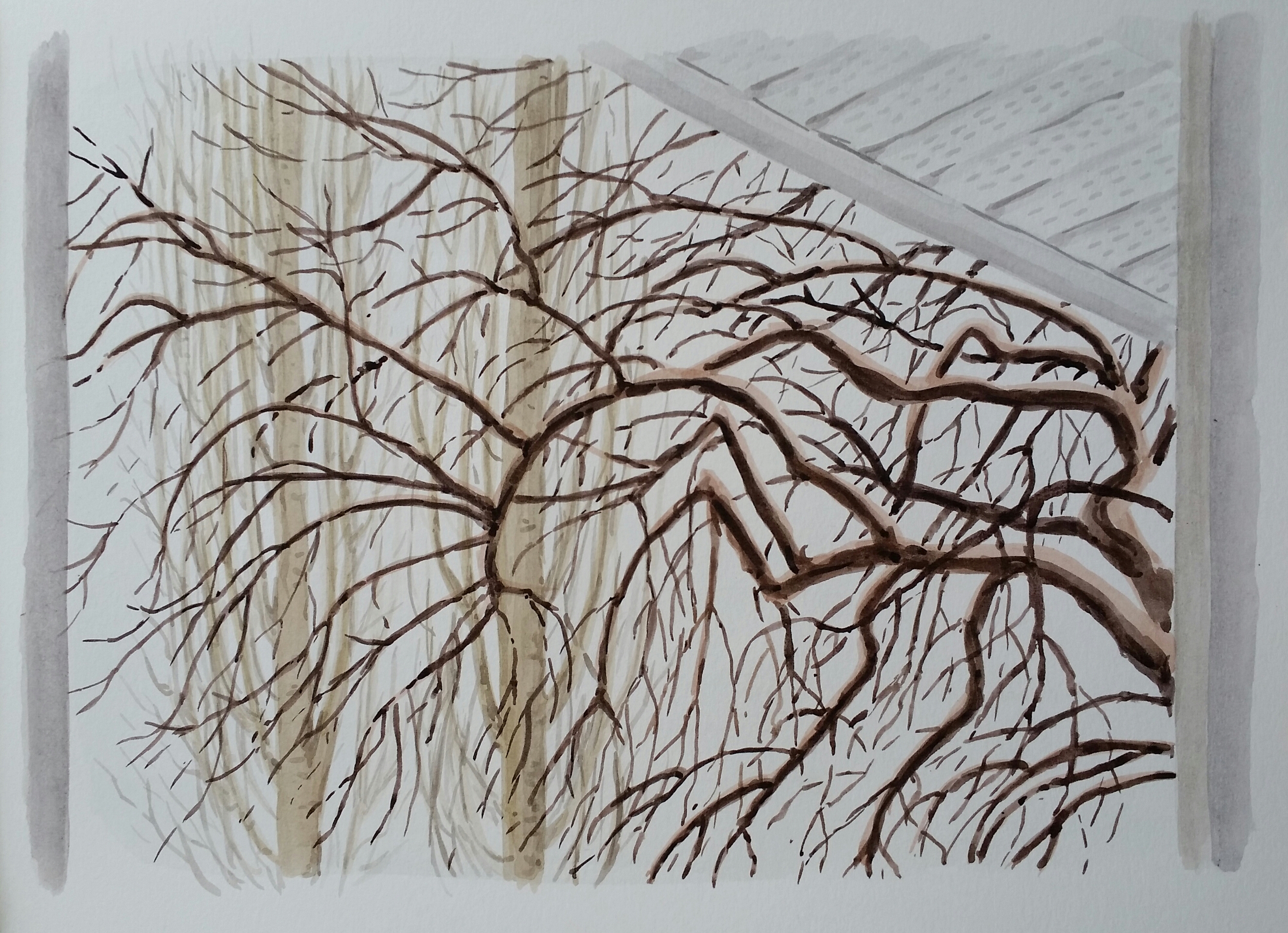 Another indoor day! Though today it was more due to the rainy weather as I am feeling much better now. So this is the view out my dining room patio door of the neighbor’s trees. I wanted to paint their crabapple tree and I was thinking of waiting until it flowered to paint it, but I don’t think that will happen in the next week. I also remembered that for some reason this tree did not flower last year so there may not any flowers to paint anyway. At first I was disappointed that it was raining and I couldn’t go out onto the deck to get more of the tree in the painting, but after finishing it I’m glad I only had to paint a portion of it.