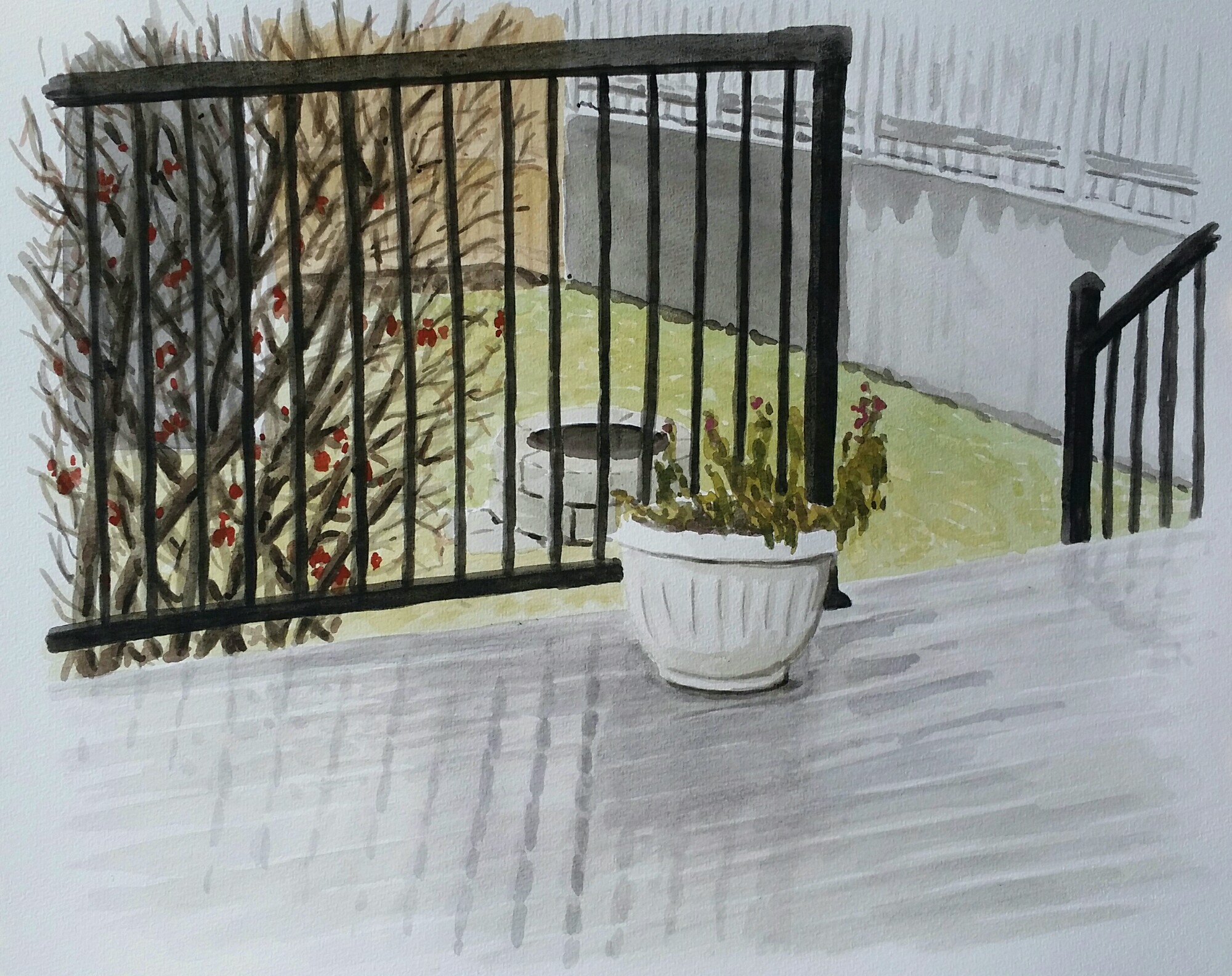 It has been pouring rain all day so here is another rainy day deck painting–this time with furniture! Other than that it doesn’t look all that different from the springtime painting, although I think I did a better job this time. Imagine that–if I paint everything twice I might get really good at it. That feels like something an art instructor may have told me at some point many years ago when I thought I knew better.