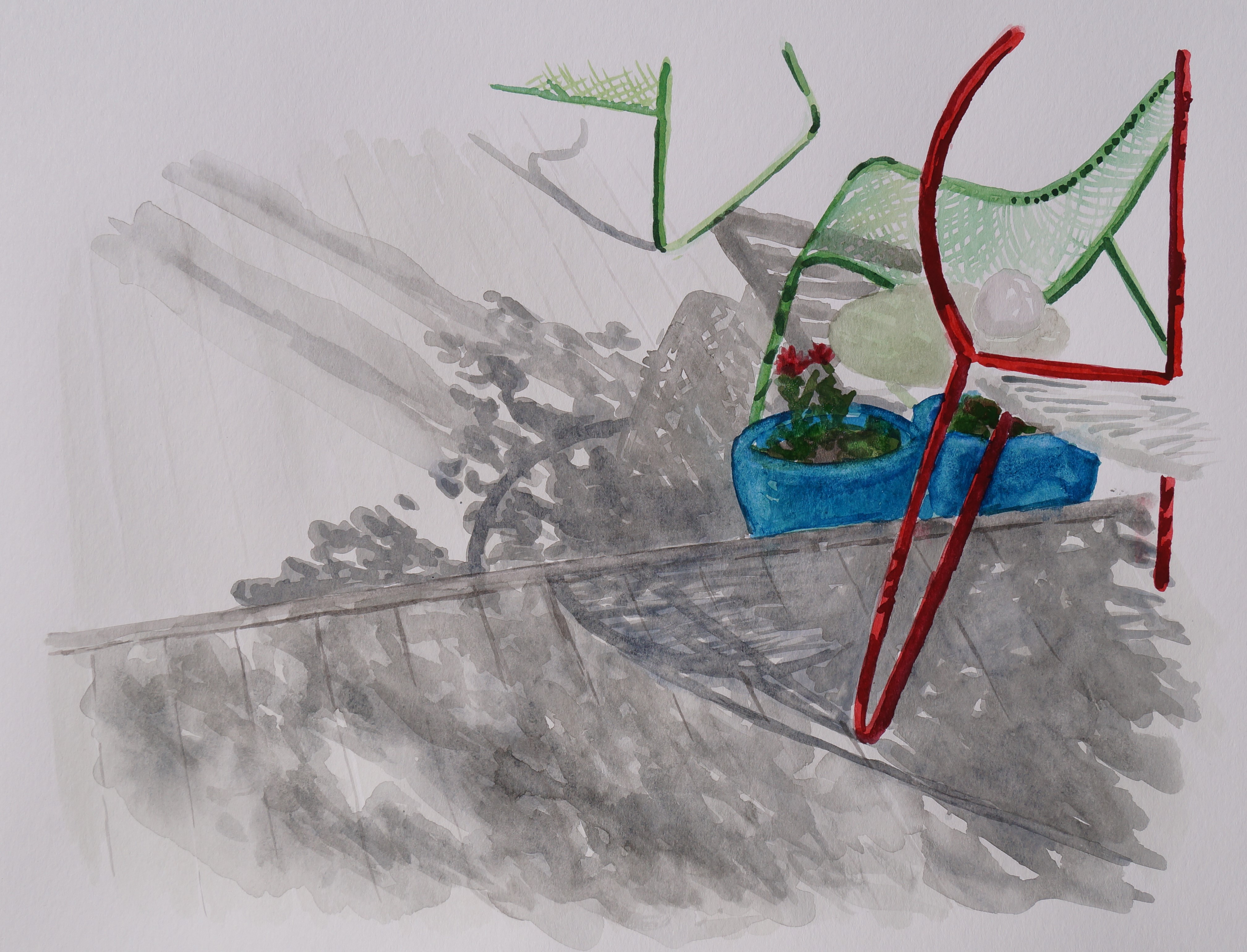 It’s a bit of an abstract painting today. I thought I would try something “simple” and just focus in on the shadows on the deck. It ended up being not at all simple, and as I was painting I realized that there were at least four different layers of shadows of varying intensity–the close-up shadows of the chairs and deck railings, the shadows of the cotoneaster shrub by the deck (the darker leaf shadows), the bit further away shadows of the neighbor’s crabapple tree (the blurrier leaf shadows in the foreground), and the furthest away shadows of the neighbor’s swedish aspen trees (the two fainter tall shadows cutting across the deck). It is interesting though, how at first it just looked like one big jumble to me until I started analysing where each shadow was coming from. It was a fun painting to do.