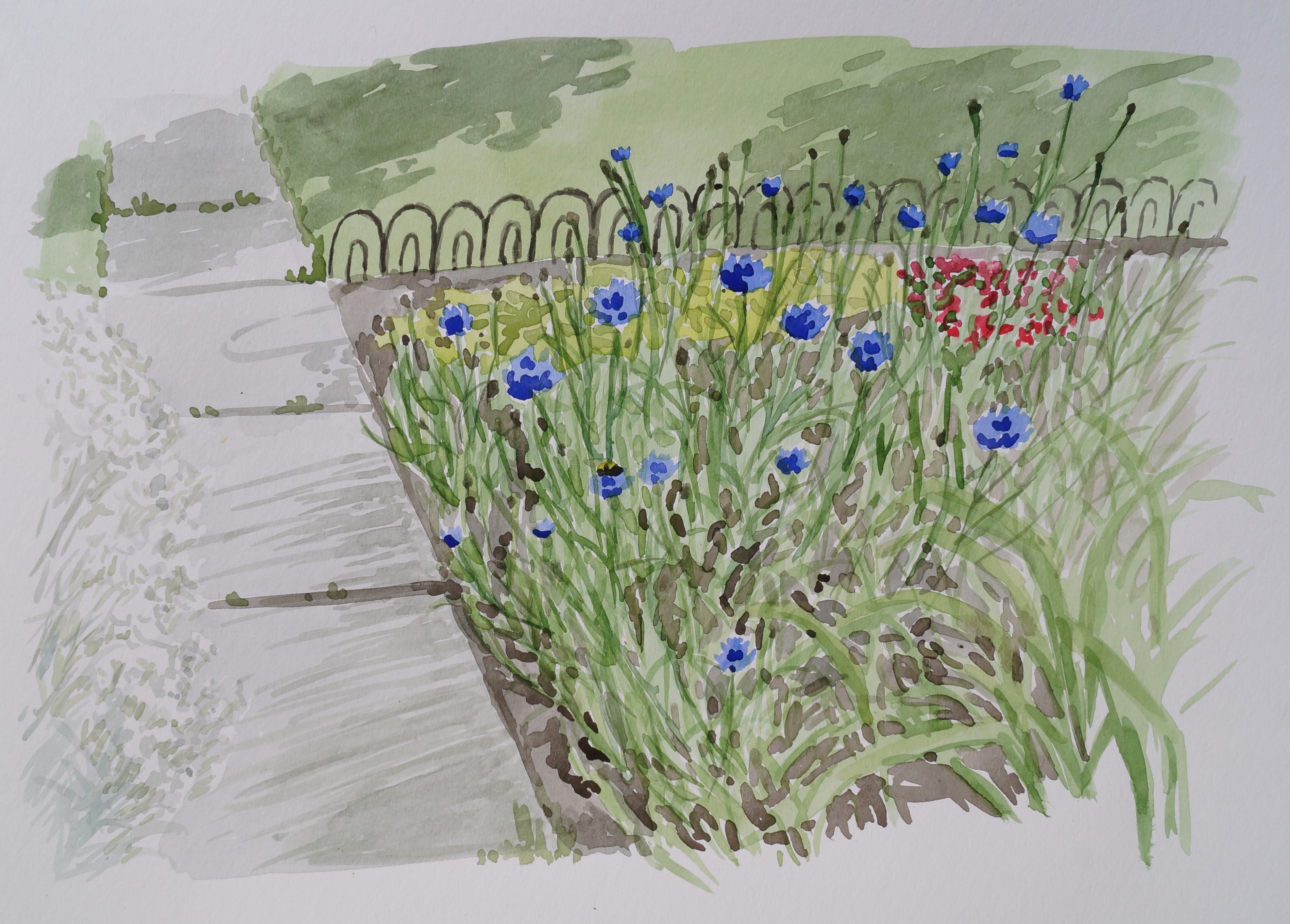 Yesterday’s painting which I did too late in the day to photograph. The flowerbed by my front steps is full of bachelor’s buttons right now (the blue flowers), and there are always bees all over them. Lately I am just sitting on the front steps to watch the bees. There is one little black and yellow blob on one of the flowers if you can find it. And once again the snow-in-summer flowers make an appearance on the left of the painting. I think when I am done my 30 days of paintings I might just spend some time painting snow-in-summer, and clouds, and bees…