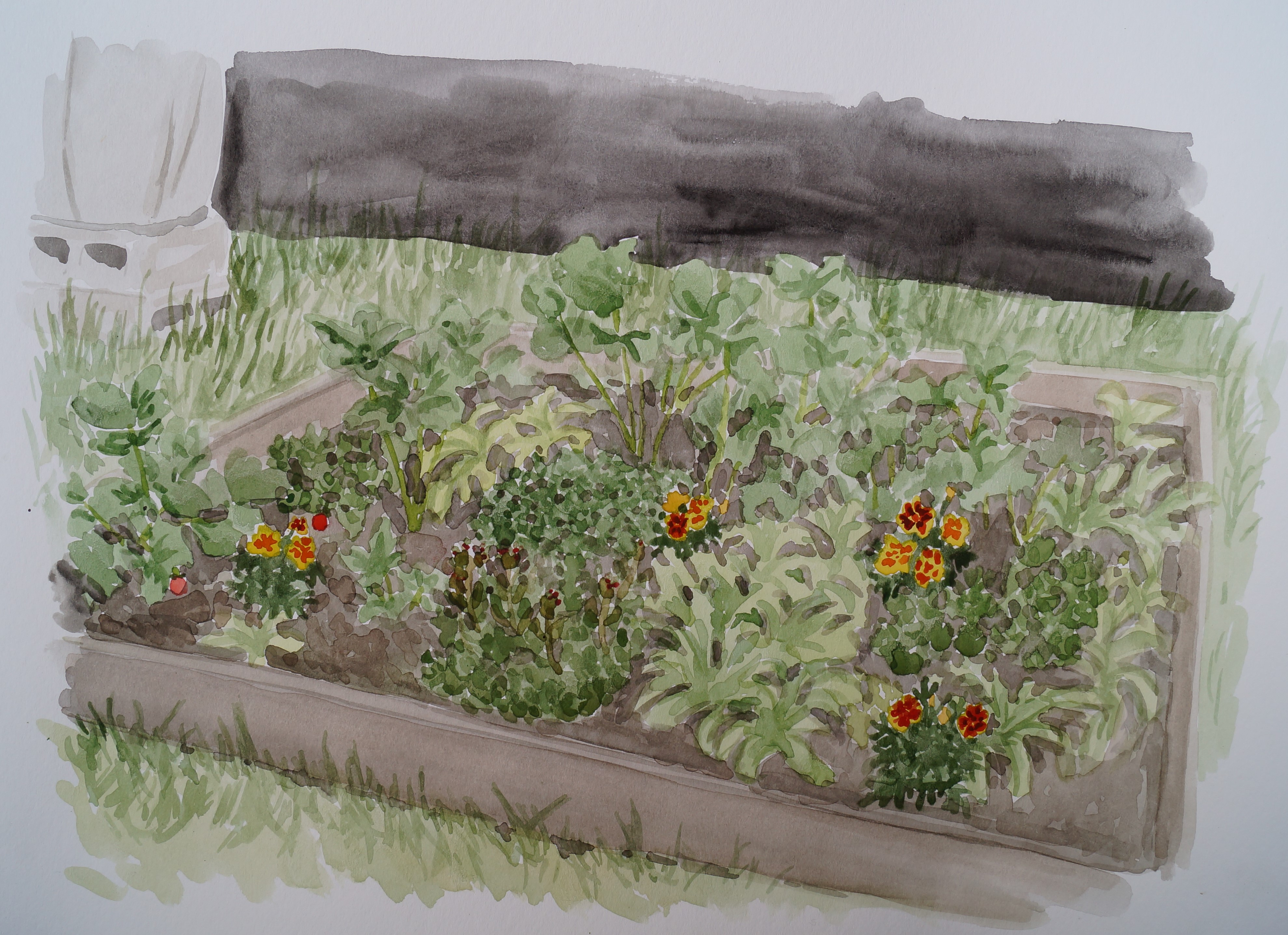 My painting from yesterday. This is my new strawberry bed. It used to be my daughter’s sandbox and now I have converted it to a raised flowerbed. I am experimenting with companion planting and simplifying my flowerbeds so this flowerbed is now all strawberries, thyme, sedums and some marigolds and calendula. I really love it. Poppy just ate the first ripe strawberry yesterday and there are tons more on the way.
