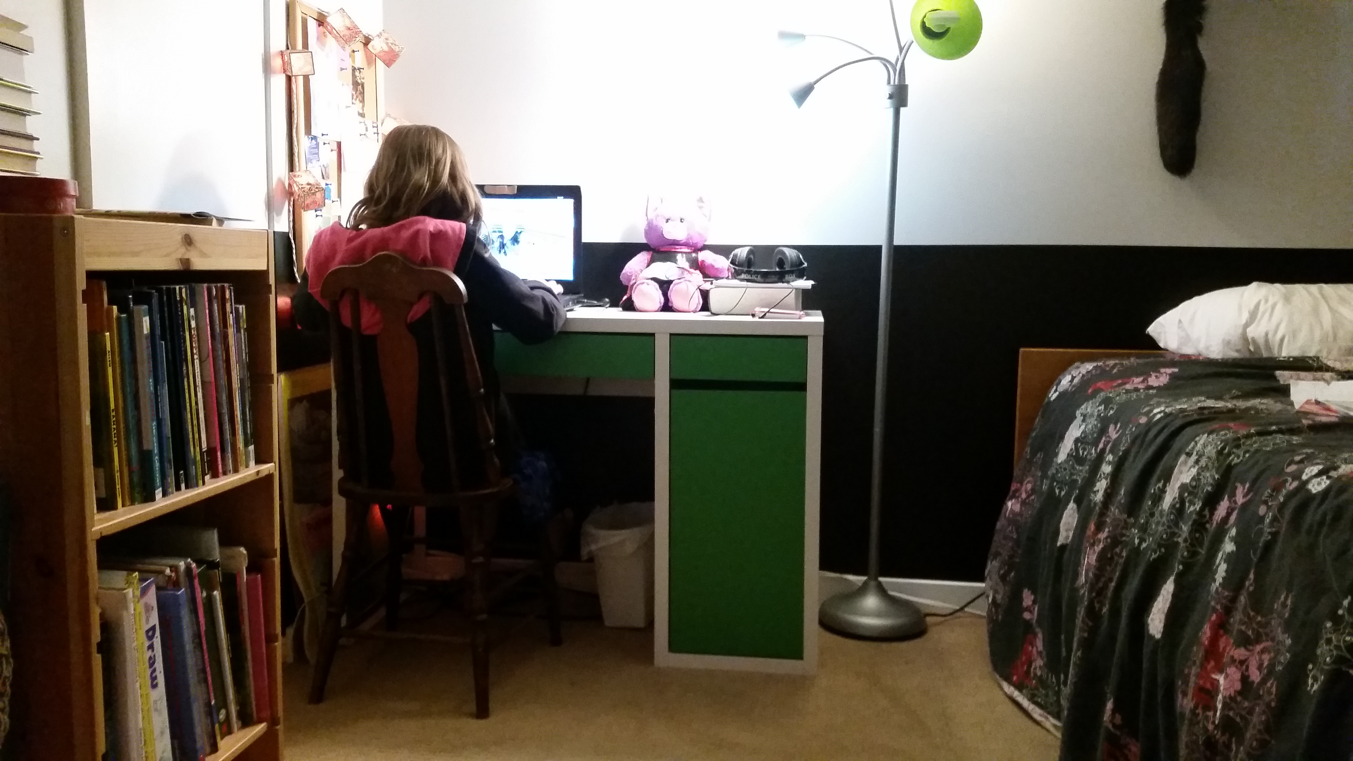 Here is a peek at my daughter’s room with the old studio desk and her new black and grey walls. We have since bought her a new white chair for the desk. Much to her chagrin, we did not let her keep the laptop, which is my husbands, in her room.