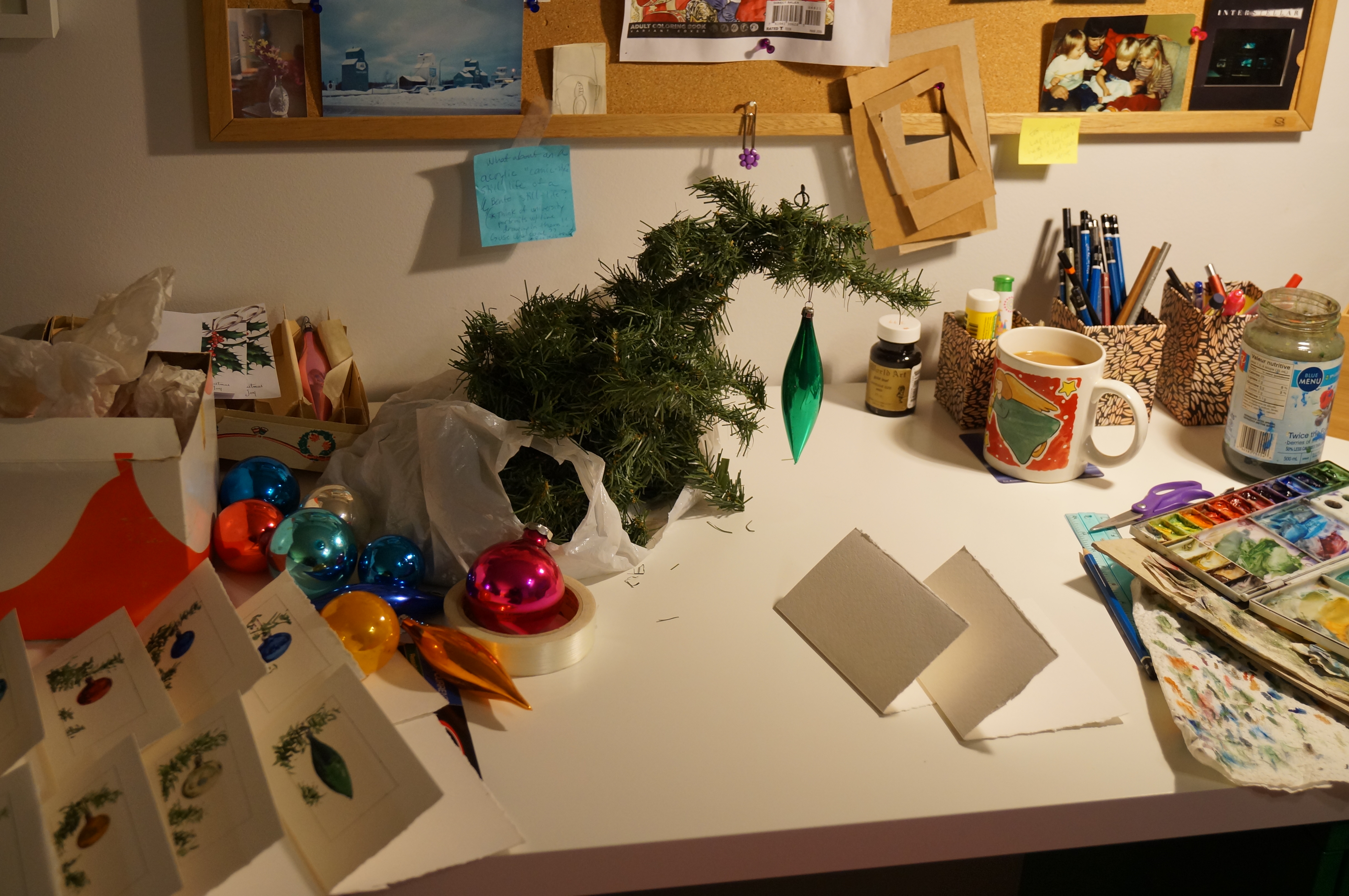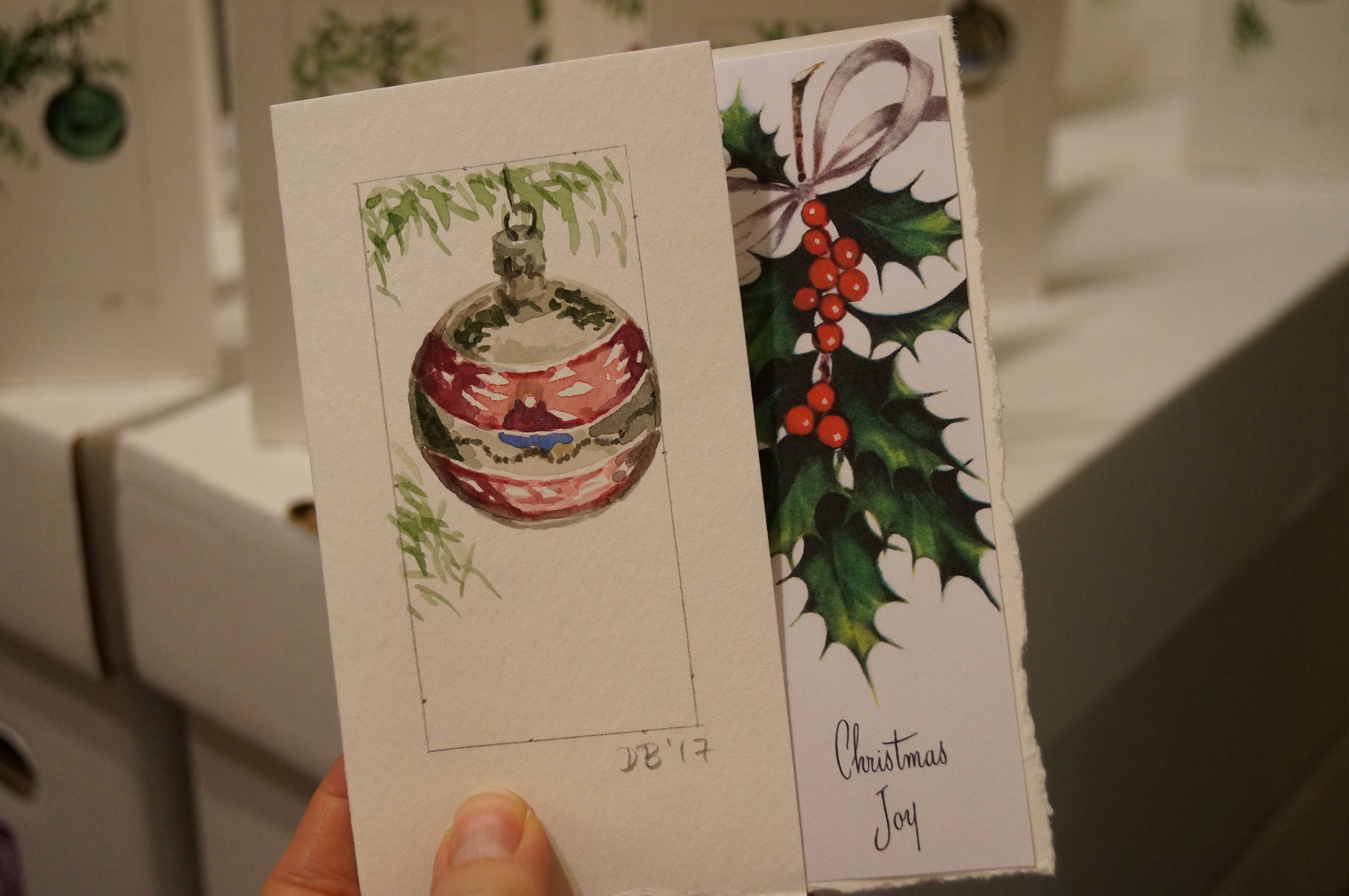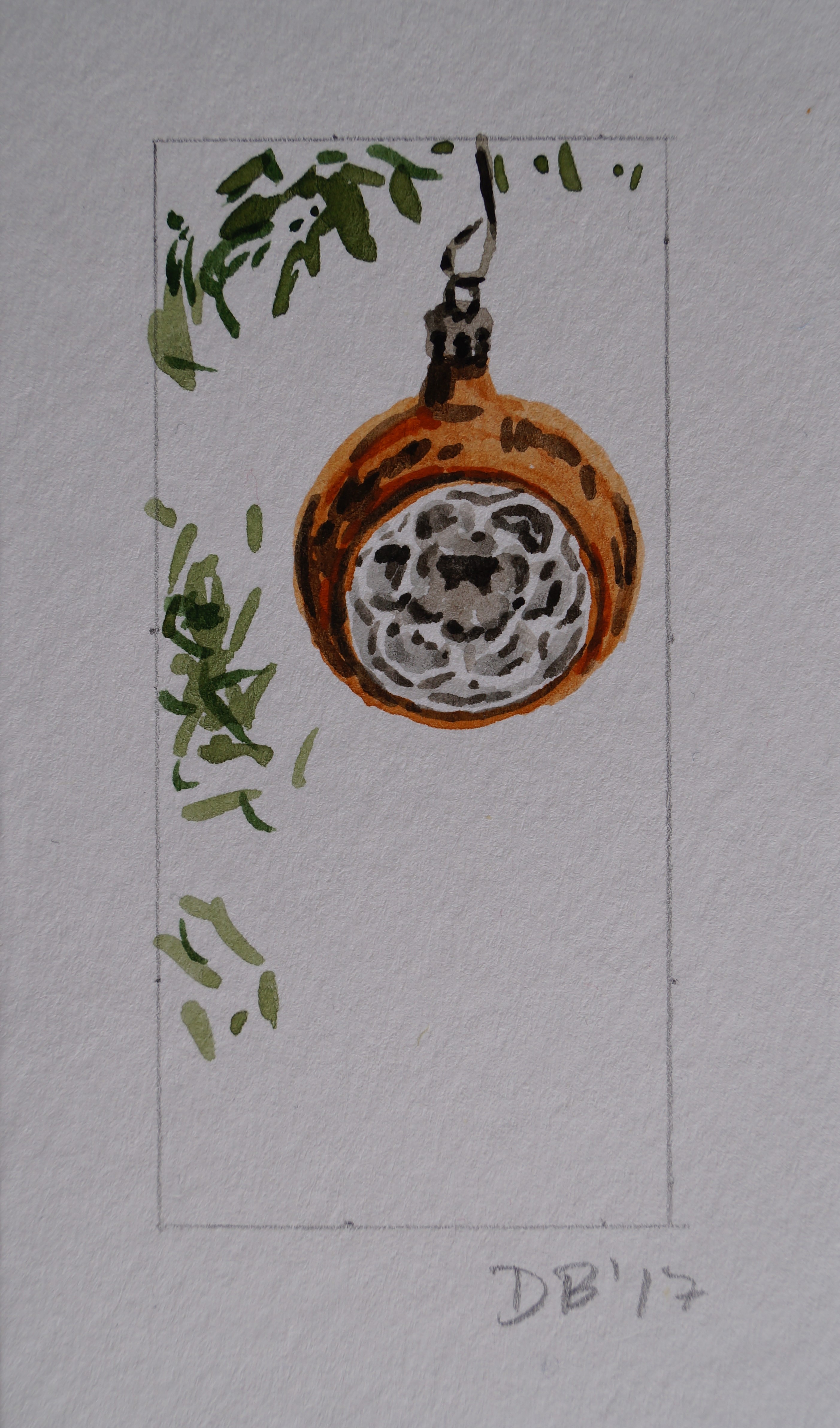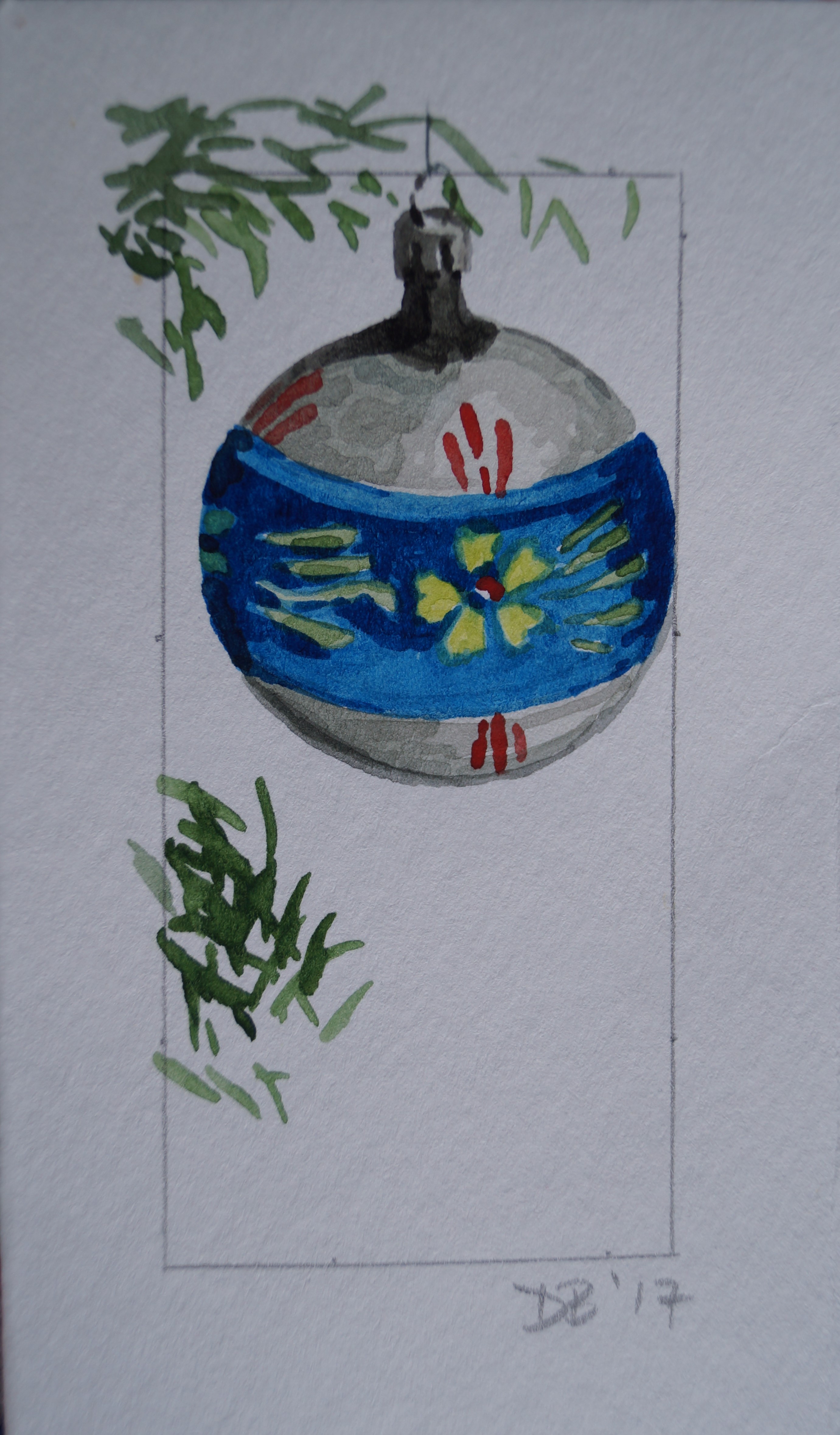It started out when I went to buy Christmas cards and I could not find any that I liked. So I went into my stash of vintage cards and copied of one of them and then painted over the bows with gold paint because they needed a little something extra. Then I was imagining telling people that I did a little hand painting on my cards, and how they might then be expecting actual hand painted cards, so in the end I just did paintings on them. I used the insides from the vintage card copies and just replaced the outer image with watercolour paper and little paintings of my vintage glass ornaments. I set up a mini still life on my desk to do them since I don’t have my tree up yet. Which, I did not realize until I was done, meant that I did not get all the tree light reflections in the ornaments–they are just straight up ornaments. Oh well, another day, another day…