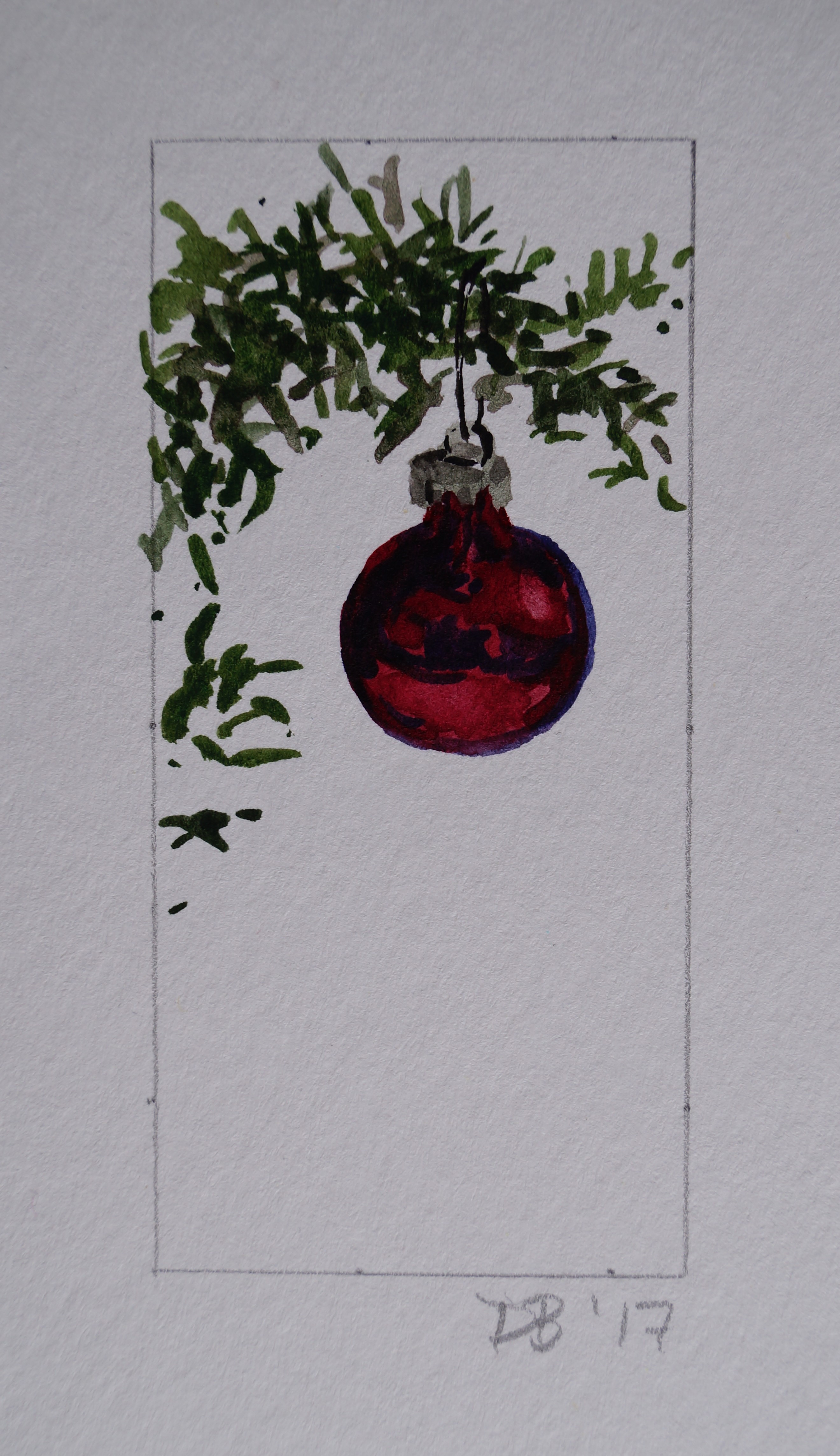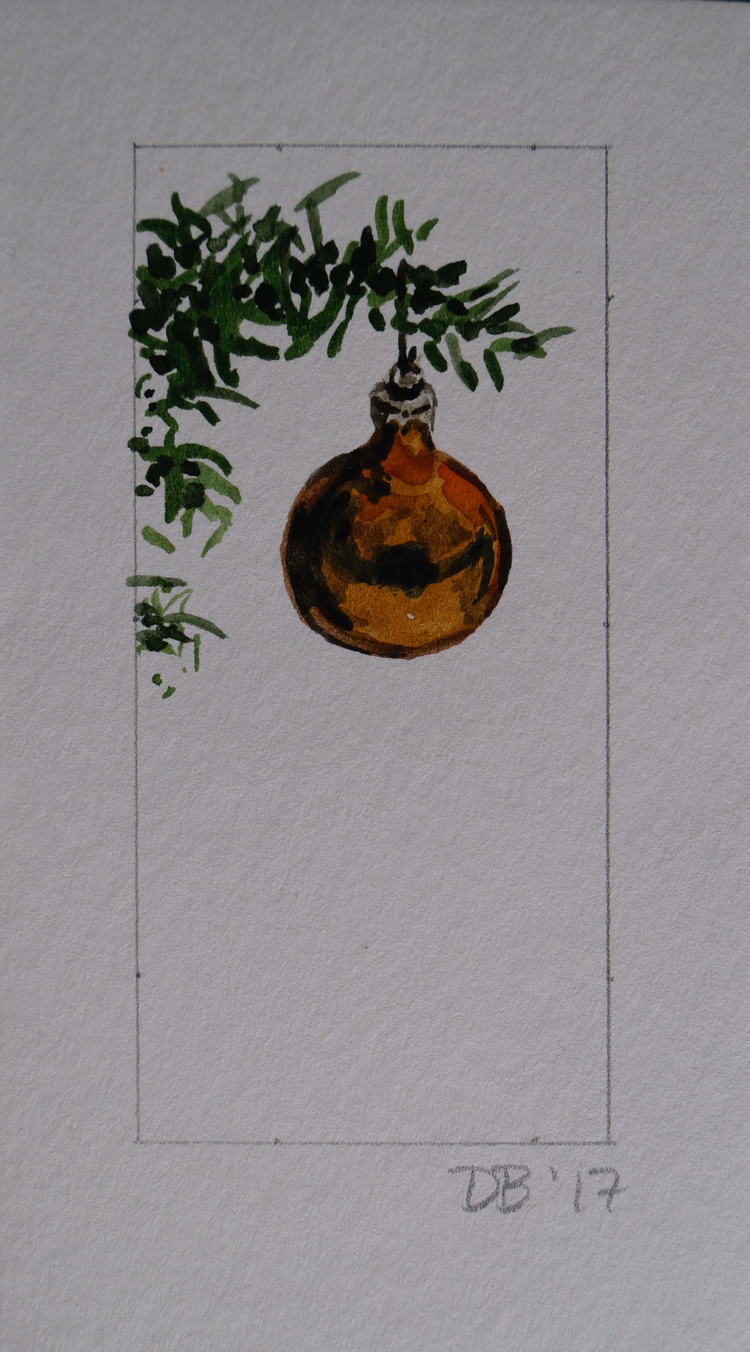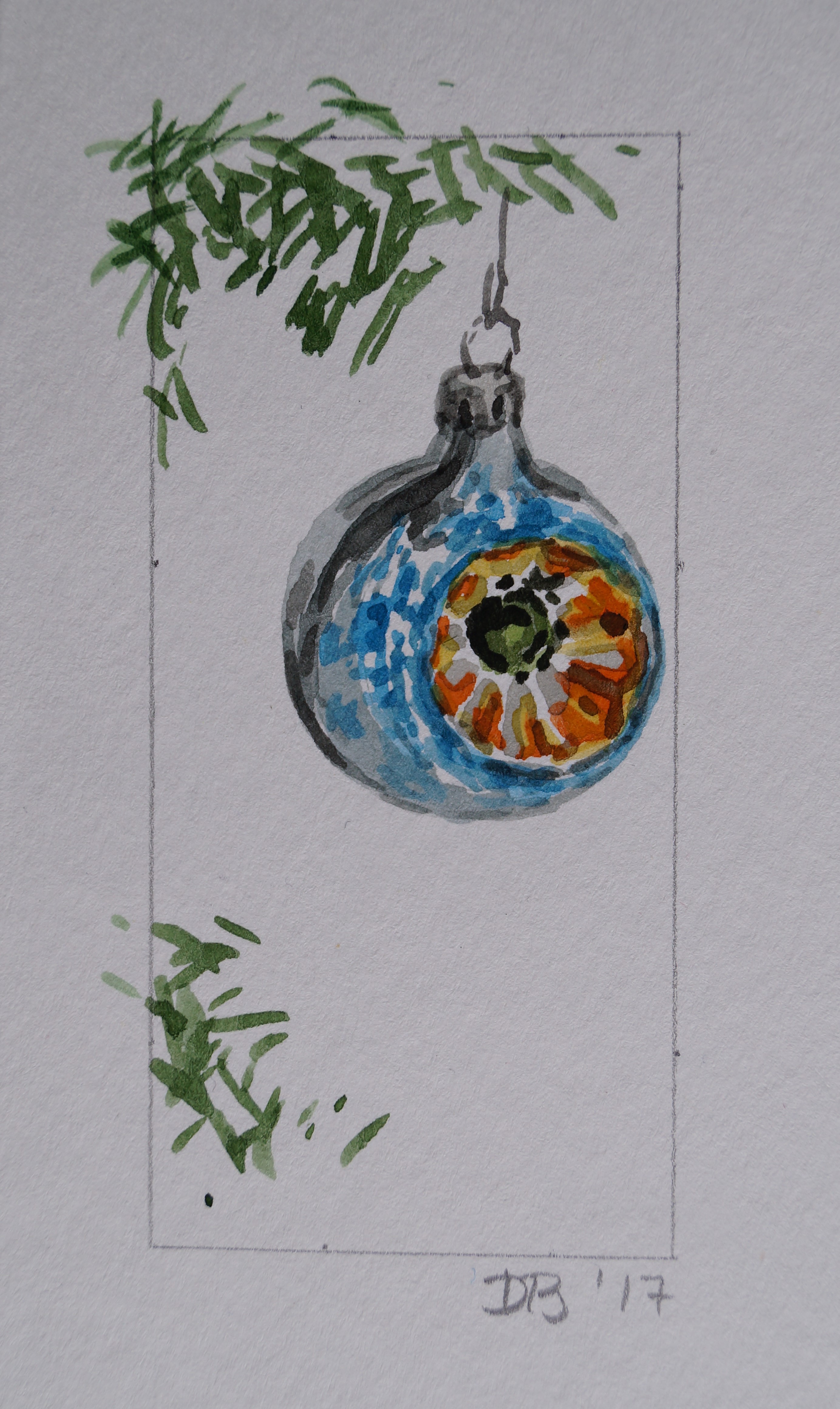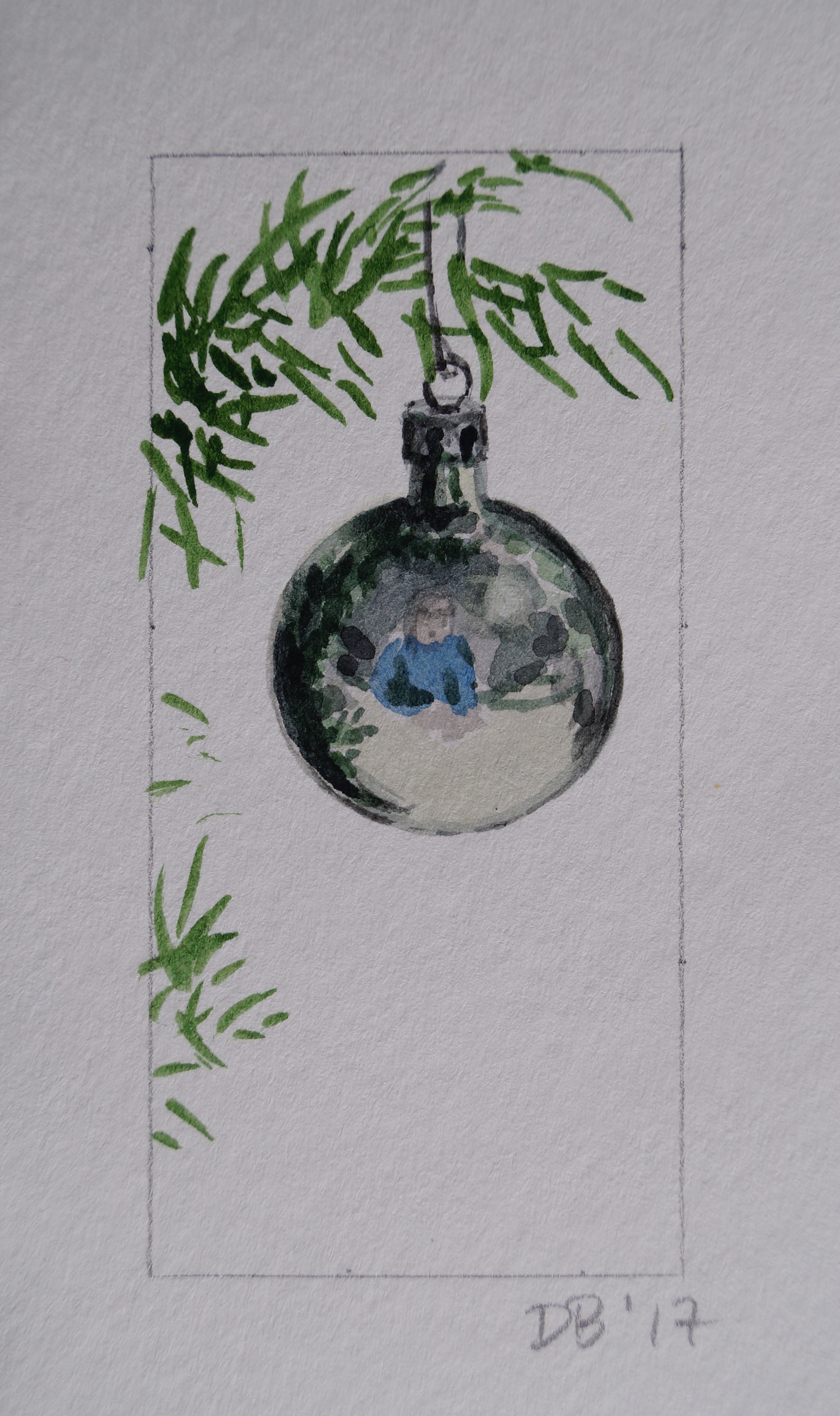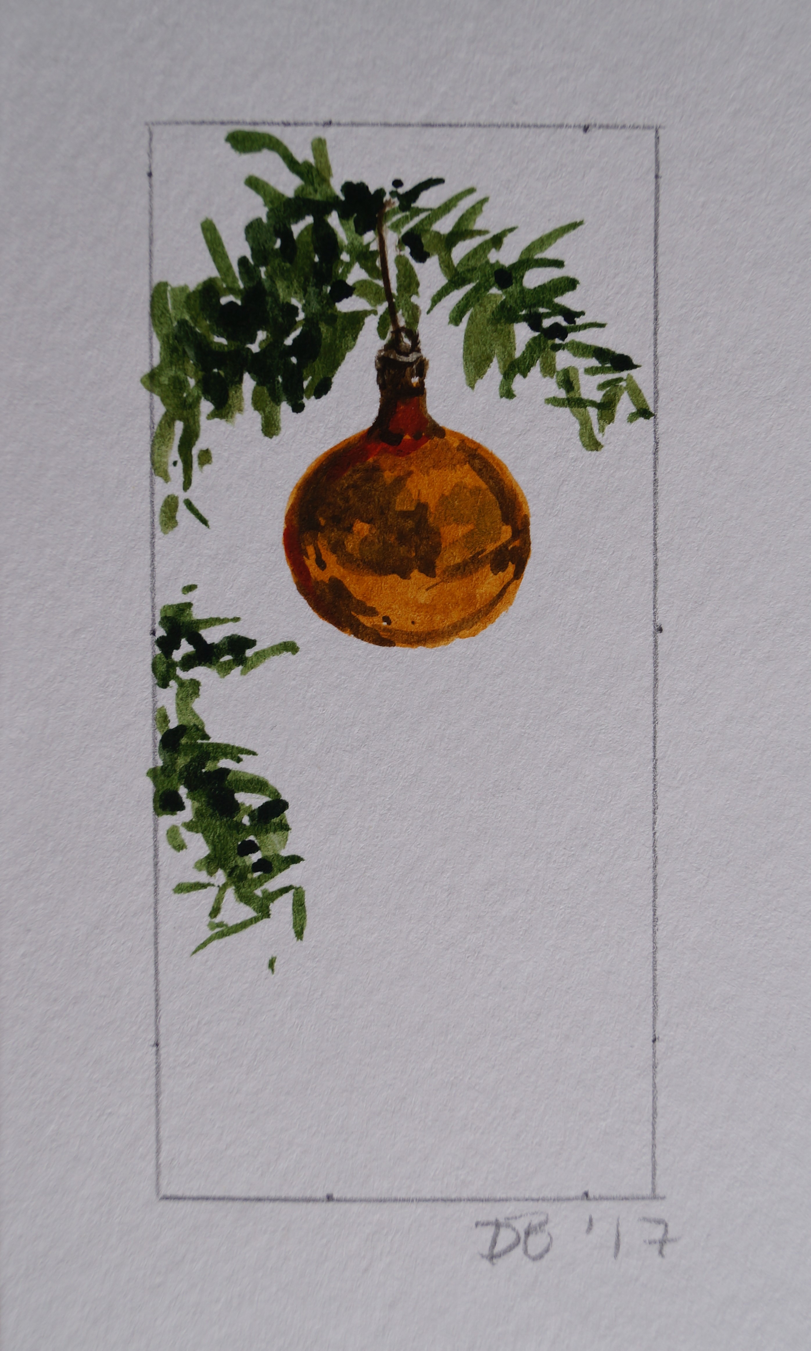 It started out when I went to buy Christmas cards and I could not find any that I liked. So I went into my stash of vintage cards and copied of one of them and then painted over the bows with gold paint because they needed a little something extra. Then I was imagining telling people that I did a little hand painting on my cards, and how they might then be expecting actual hand painted cards, so in the end I just did paintings on them. I used the insides from the vintage card copies and just replaced the outer image with watercolour paper and little paintings of my vintage glass ornaments. I set up a mini still life on my desk to do them since I don’t have my tree up yet. Which, I did not realize until I was done, meant that I did not get all the tree light reflections in the ornaments–they are just straight up ornaments. Oh well, another day, another day…