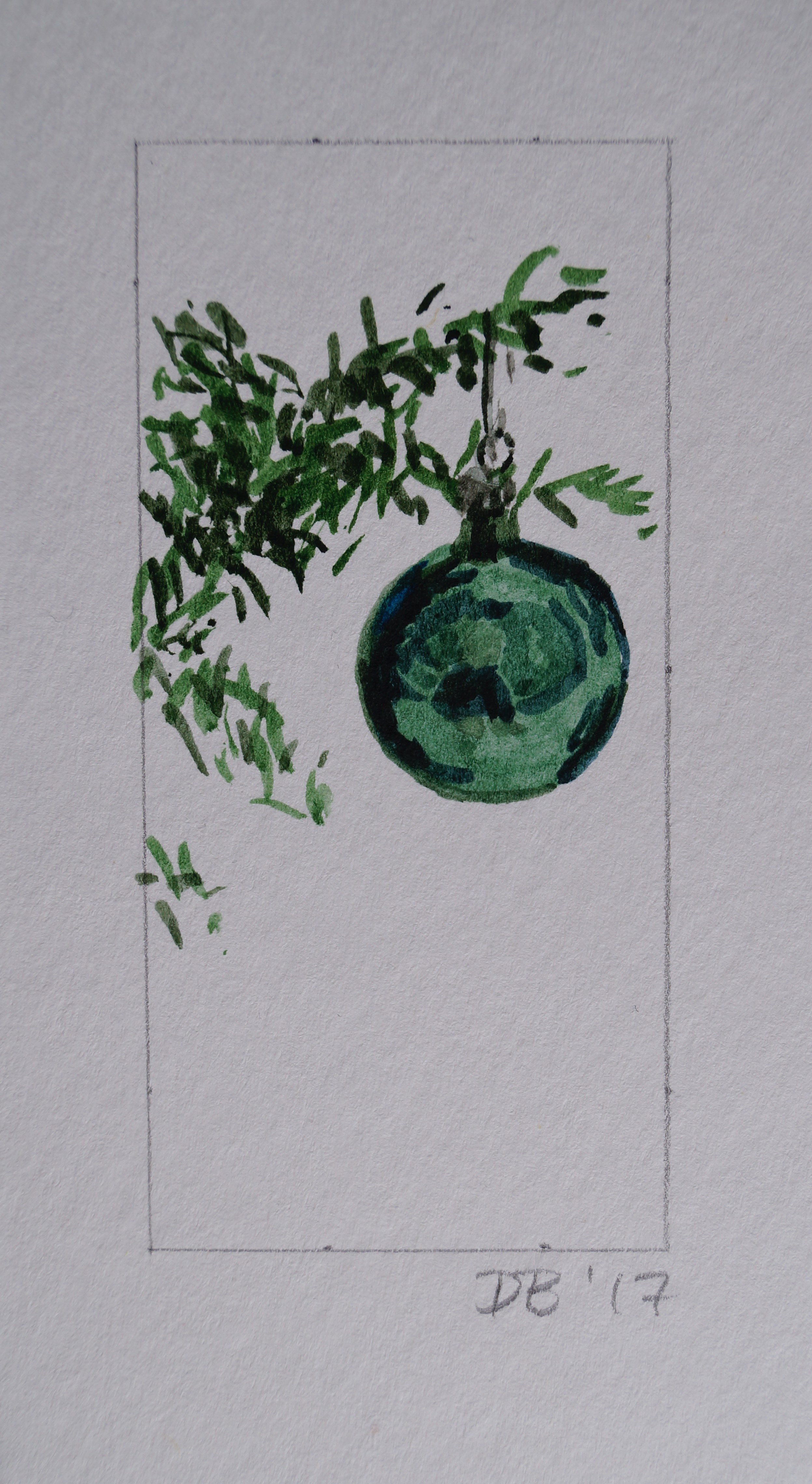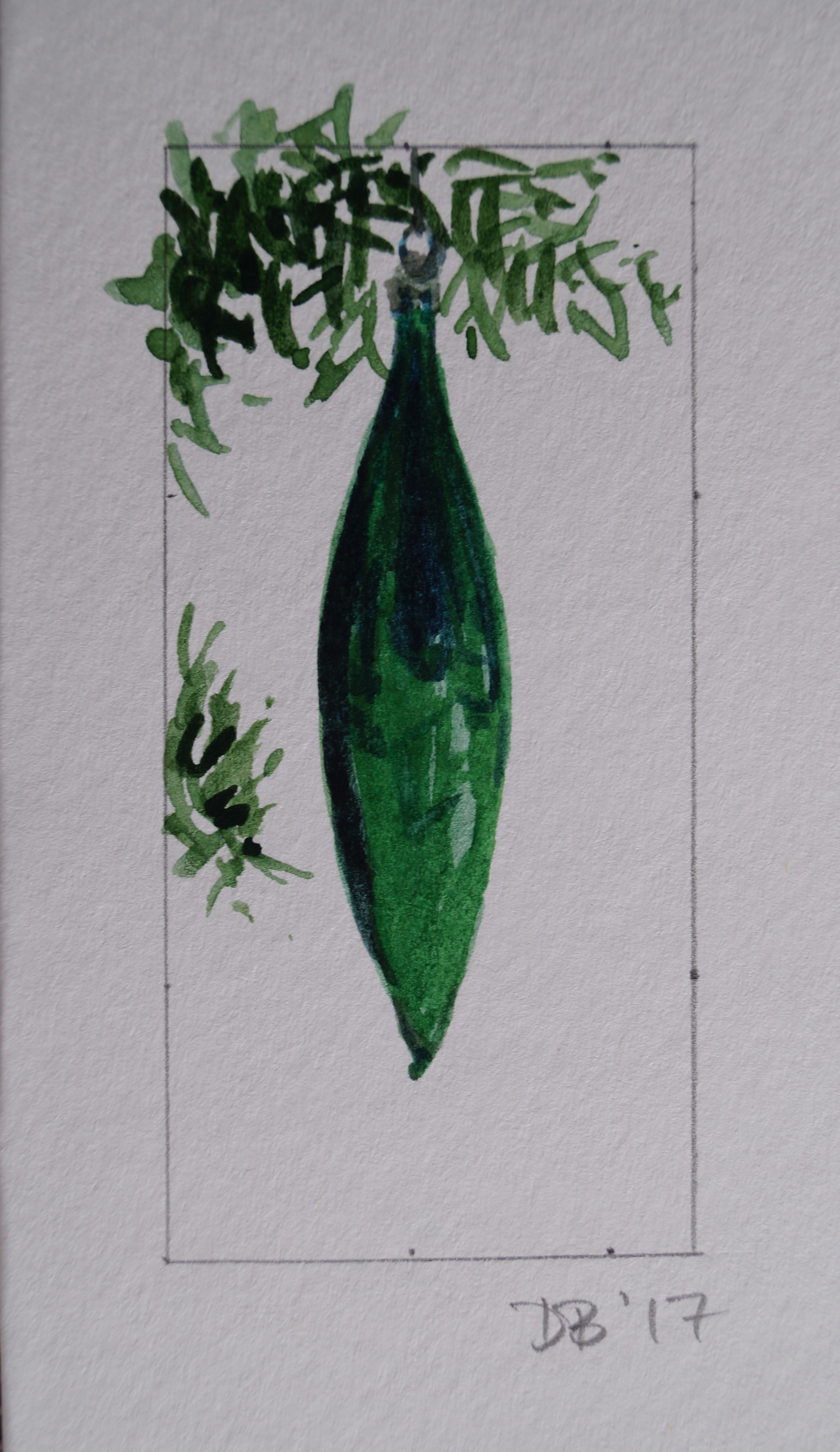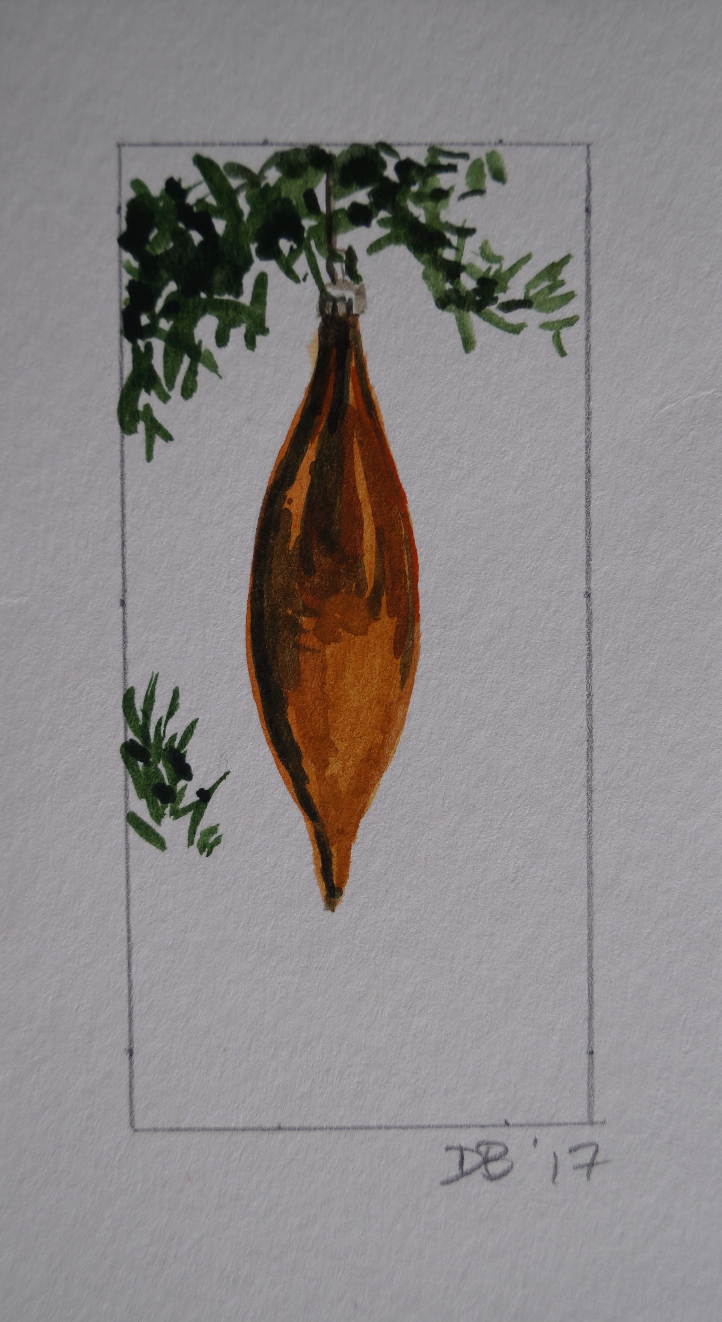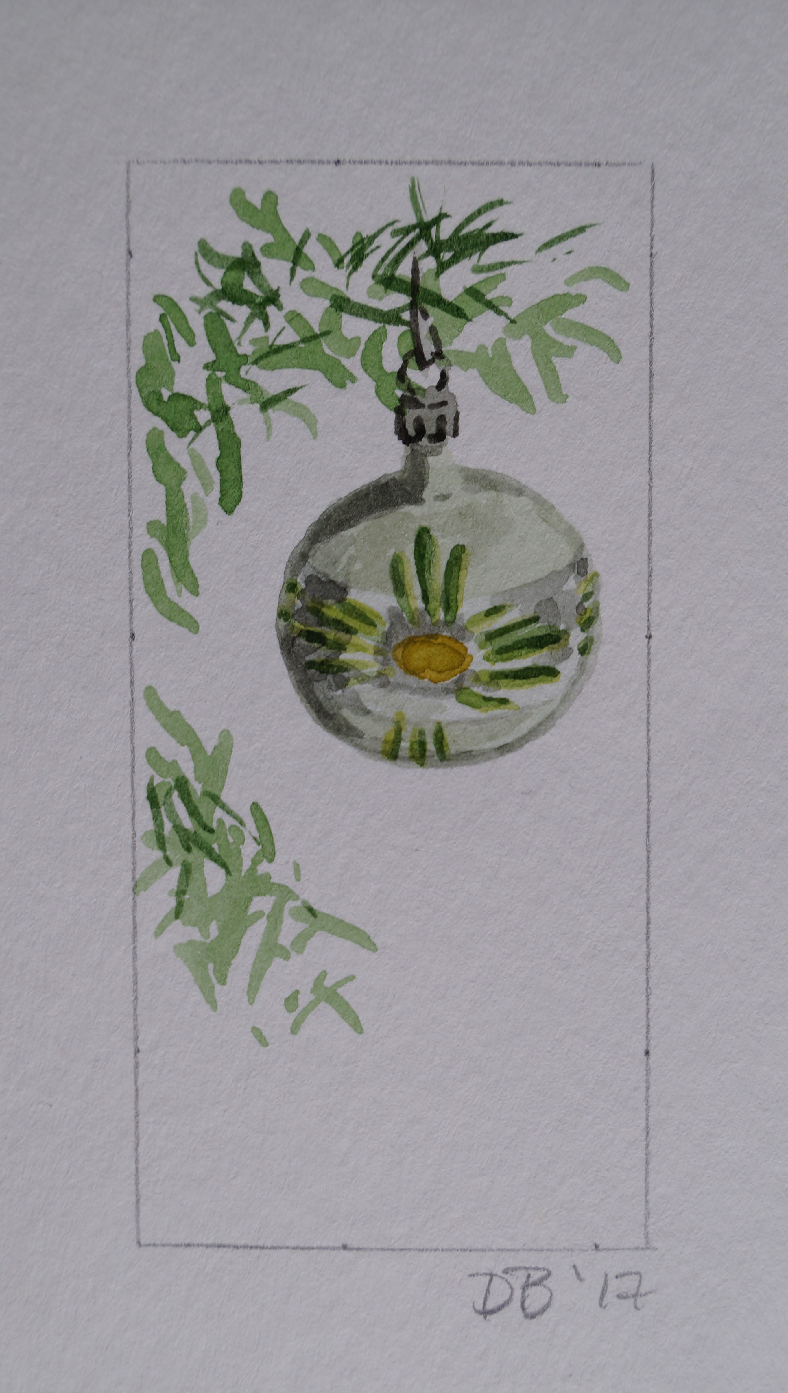 It started out when I went to buy Christmas cards and I could not find any that I liked. So I went into my stash of vintage cards and copied of one of them and then painted over the bows with gold paint because they needed a little something extra. Then I was imagining telling people that I did a little hand painting on my cards, and how they might then be expecting actual hand painted cards, so in the end I just did paintings on them. I used the insides from the vintage card copies and just replaced the outer image with watercolour paper and little paintings of my vintage glass ornaments. I set up a mini still life on my desk to do them since I don’t have my tree up yet. Which, I did not realize until I was done, meant that I did not get all the tree light reflections in the ornaments–they are just straight up ornaments. Oh well, another day, another day…