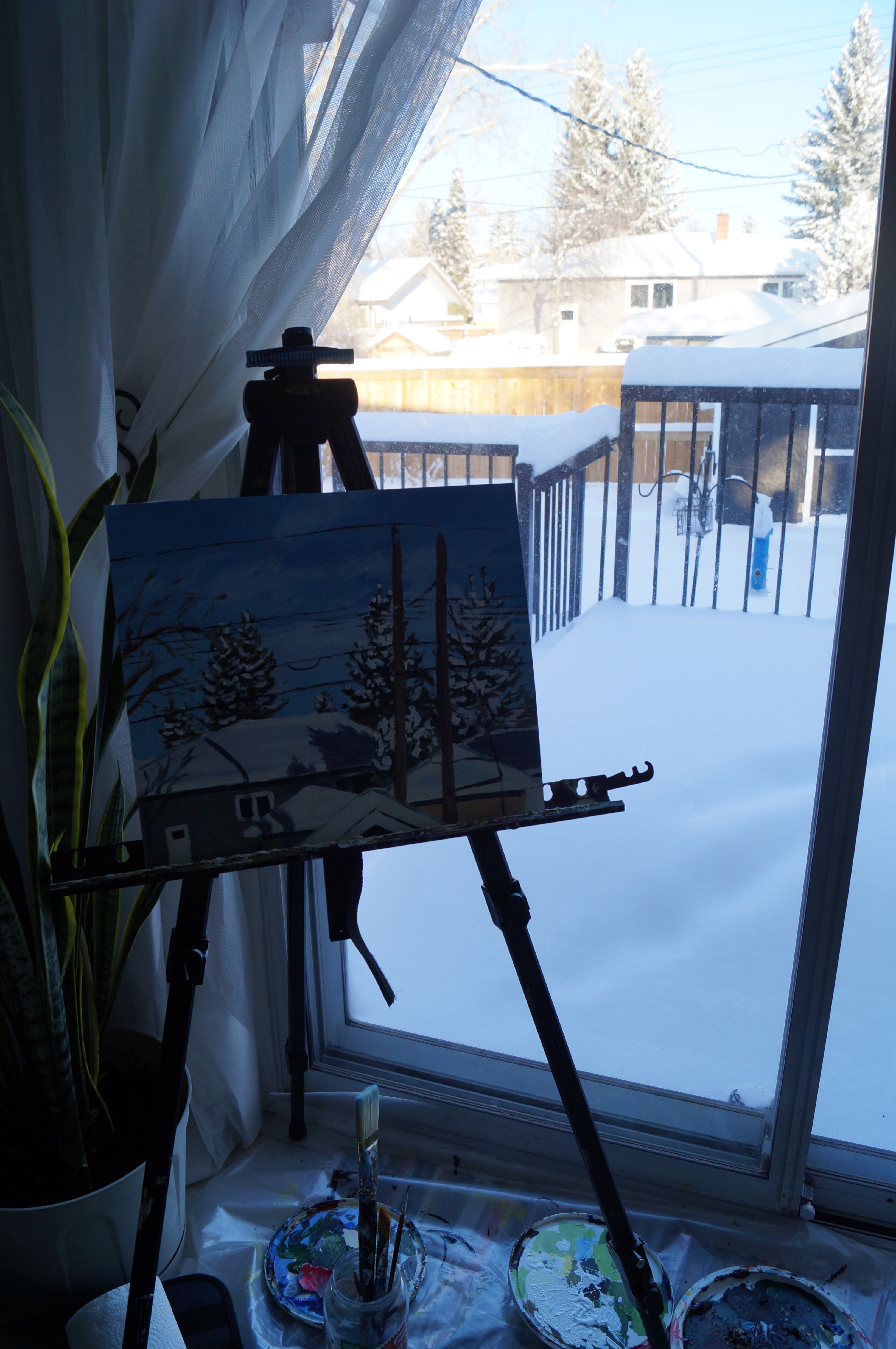 Calgary got a huge dump of snow and it is beautiful. Not so good for anyone having to drive, but lucky for me I didn’t have to leave the house today. Seeing as I didn’t have to go anywhere, I decided to get out my acrylics and do a “real” painting of the view from the dining room of the back alley with all the fresh snow. I don’t know why watercolour paintings always feel like studies to me; I think I actually paint better with watercolour, but I LOVE painting with acrylic! And what I mess I made too. I even put down a shower curtain where I set up my easel in the kitchen, but I still managed to get paint on the microwave.