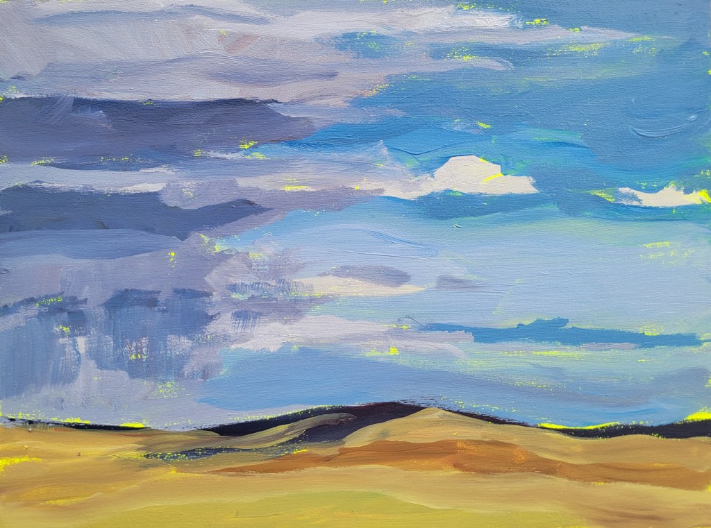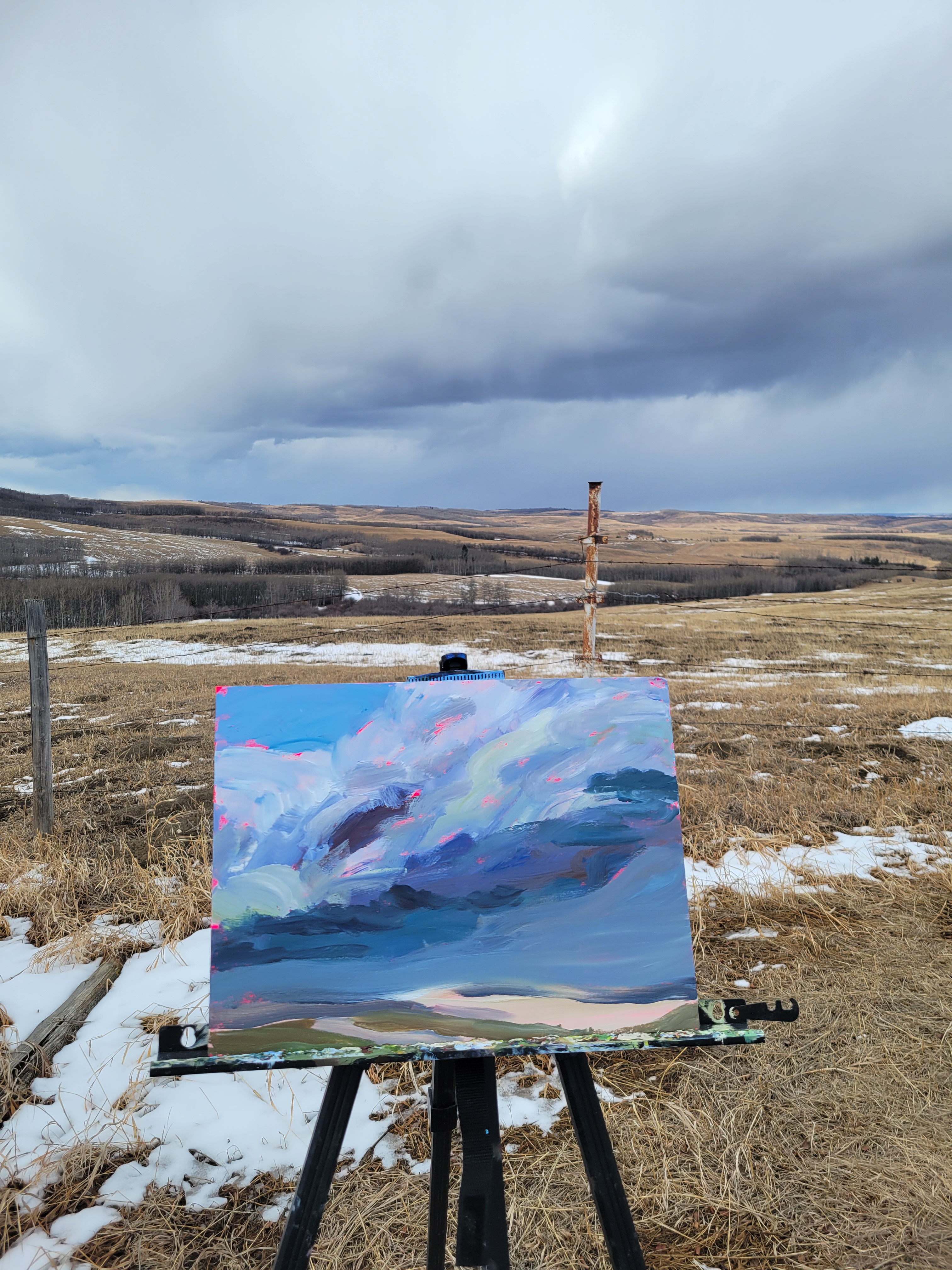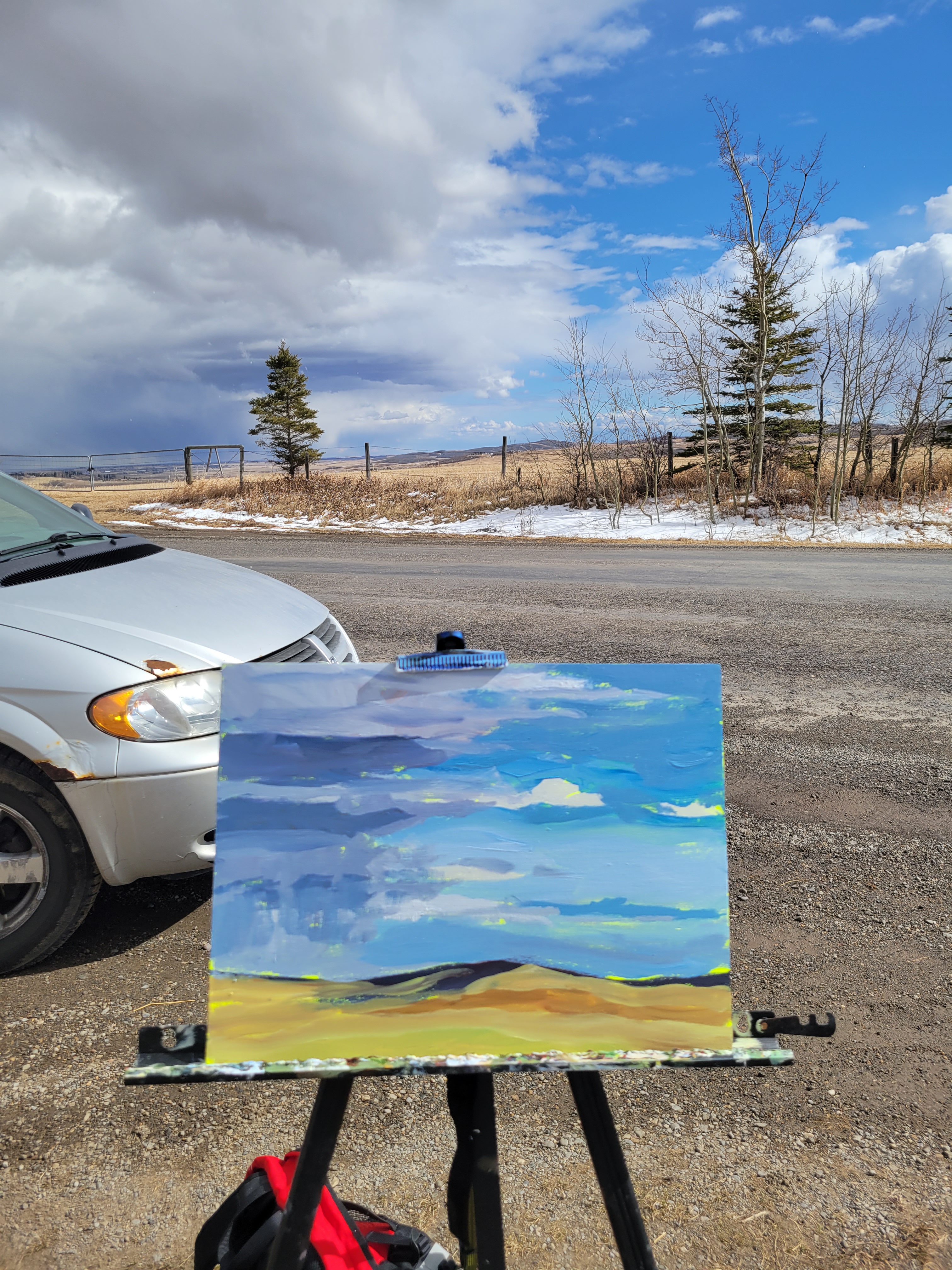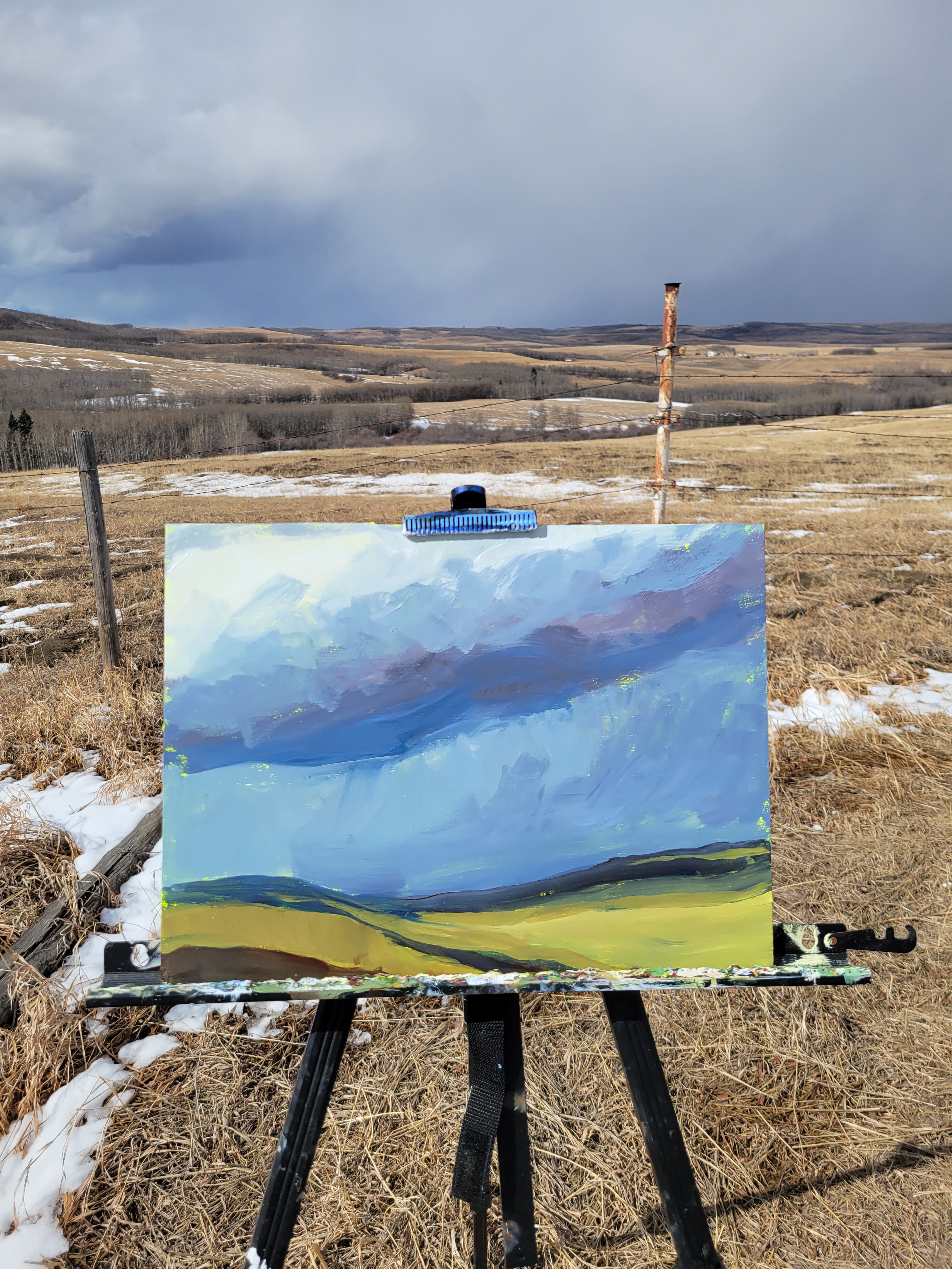 I went out and did some plain air painting yesterday! It was a beautiful sunny day, but there were big grey snow clouds coming from the mountains in the west, so I was trying to stay ahead of the clouds…and I ended up painting them in all three paintings. These were done fairly quickly (it took me about 2 1/2 hours)–I am trying to loosen up with my painting again and just have fun with it. I painted right up until the clouds caught up with me and it started to snow, at which point the sun was covered anyway so I called it a day.